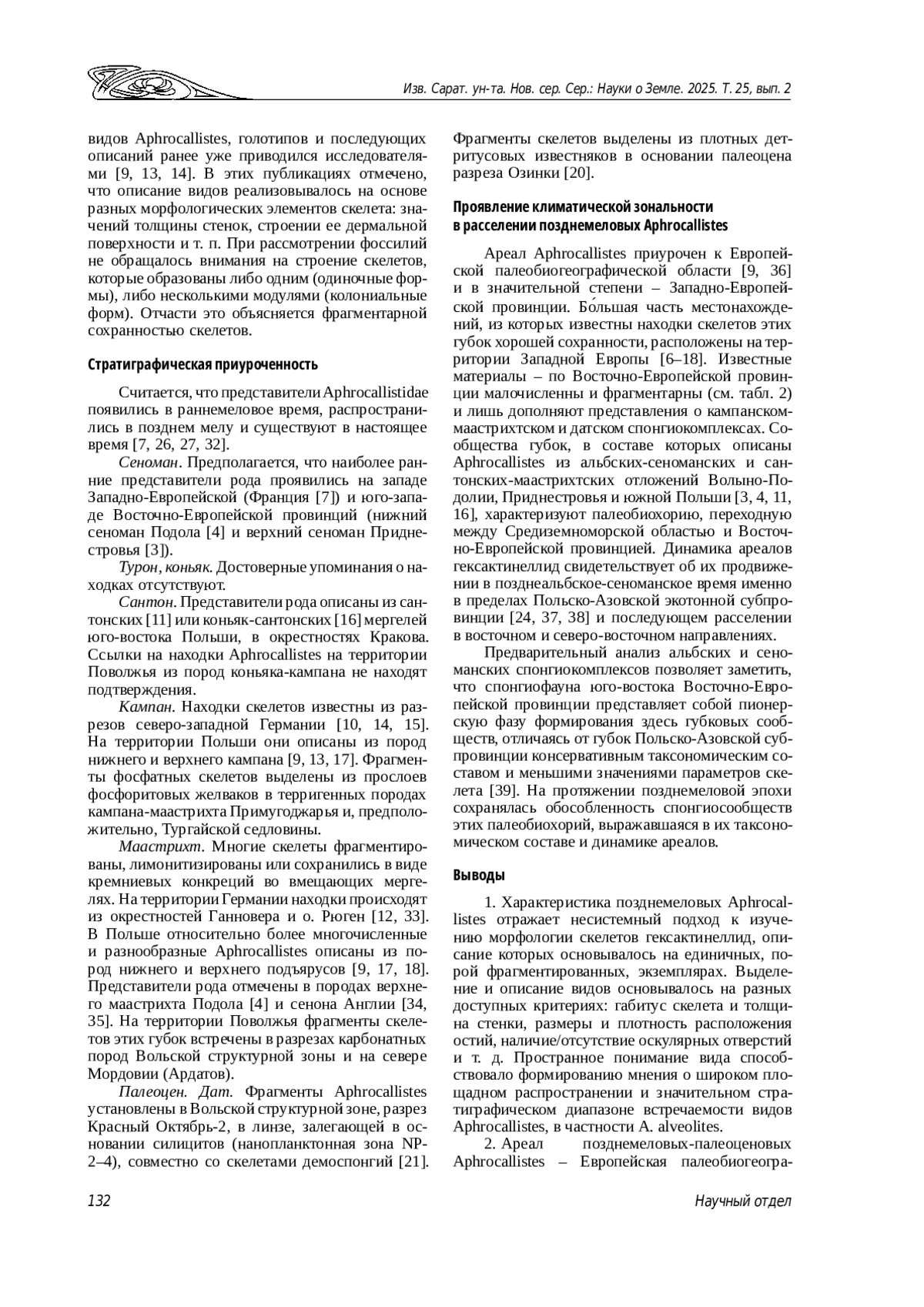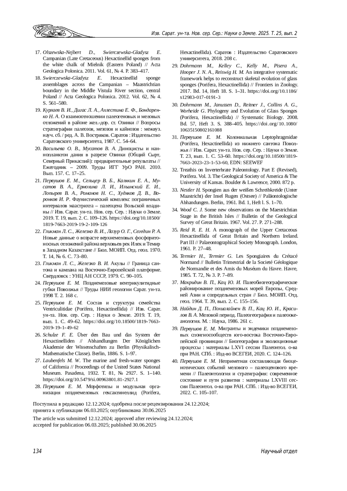 25. 	Первушов Е. М. Состав и структура семейства Ventriculitidae (Porifera, Hexactinellida) // Изв. Сарат. ун-та. Нов. сер. Сер.: Науки о Земле. 2019. Т. 19, вып. 1. С. 49-62. DOI: 10.18500/1819-7663-2019-19-1-49-62