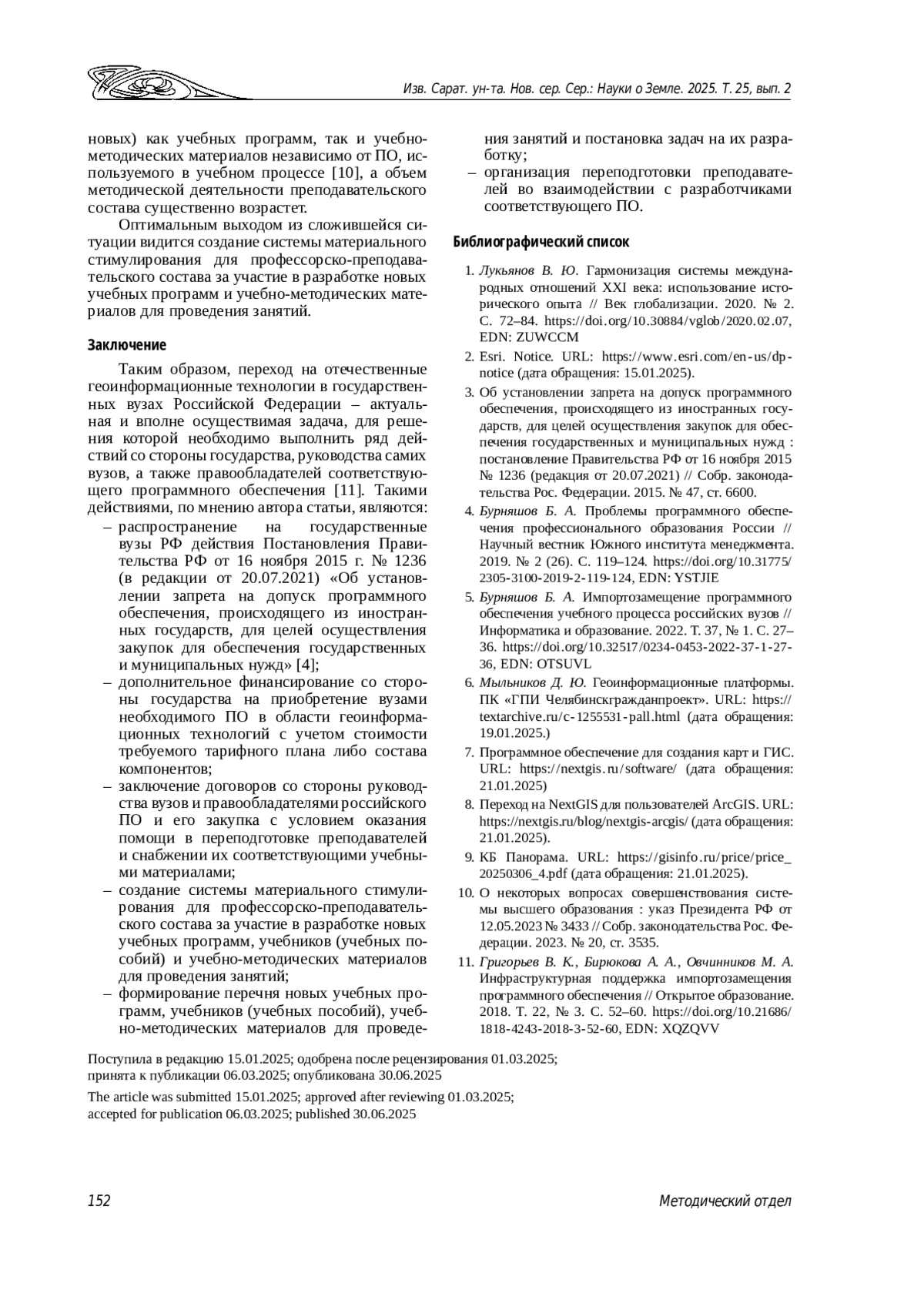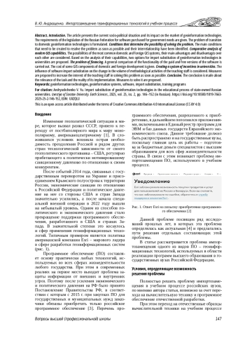 Введение. Представлено состояние современной общественно-политической обстановки и ее влияние на рынок геоинформационных технологий. Приведены требования законодательства РФ к приобретаемому для государственных нужд программному обеспечению. Сформулирована проблема перехода на отечественные геоинформационные технологии. Условия, определяющие возможность решения проблемы. Определены основные условия, которые необходимо создать для скорейшего решения проблемы и их взаимосвязь. Сравнительный анализ возможностей современных ГИС. Рассмотрены возможности наиболее распространенных отечественных и зарубежных ГИС, их основные преимущества и недостатки друг перед другом. Исходя из анализа их возможностей предложены два варианта импортозамещения геоинформационных технологий в вузах. Проблема финансирования. Проведено общее сравнение функционала платных и бесплатных версий программного обеспечения. Приведена стоимость некоторых компонентов ГИС отечественной и зарубежной разработки. Создание системы стимулов в вузах. Рассмотрено влияние проведения импортозамещения программного обеспечения на изменение объема методической деятельности профессорско-преподавательского состава. Предложены меры по повышению заинтересованности профессорско-преподавательского состава в скорейшем решении данной проблемы. Заключение. Сделан вывод об актуальности поставленной задачи и о реальности ее выполнения. Предложены меры для ее решения.