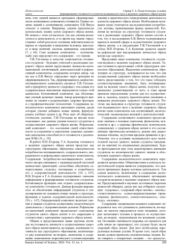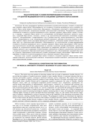 В статье раскрывается проблема воспитания студенческой молодежи, готовой к осуществлению здорового образа жизни. Обосновывается, что готовность студентов медицинского вуза к ведению здорового образа жизни является личностным образованием, обладающим структурой и включающим когнитивный, аксиологический, эмоционально-волевой, деятельностный компоненты. Раскрывается содержание компонентов готовности студентов медицинского вуза к ведению здорового образа жизни: знание о человеке, о здоровье, о здоровом образе жизни и его составляющих (когнитивный компонент); ценности «здоровье», «здоровый образ жизни», «человек», «жизнь» и др. (аксиологический компонент); позитивные эмоции: «радость», «воодушевление», «умиротворение» и др. и волевые качества: «целеустремленность», «настойчивость», «инициативность» и др. (эмоционально-волевой компонент); действия и поступки студента по ведению здорового образа жизни: регулярная физическая активность, соблюдение правил личной гигиены и режима дня и др. (деятельностный компонент). Обосновывается, что педагогические условия формирования готовности студентов медицинского вуза к ведению здорового образа жизни представляют собой систему мер педагогического воздействия, направленных на освоение студентами знаний, приобщение к ценностям, развитие их эмоционально-волевой сферы, ориентацию на совершение действий и поступков, образующих (знания, ценности и др.) содержание соответствующих компонентов готовности, реализуемую (система мер) с опорой на возможности образовательной среды медицинского вуза, обеспечивающие здоровый образ жизни студентов. Определяются педагогические условия, реализация которых обеспечивает эффективное формирование готовности студентов медицинского вуза к ведению здорового образа жизни.