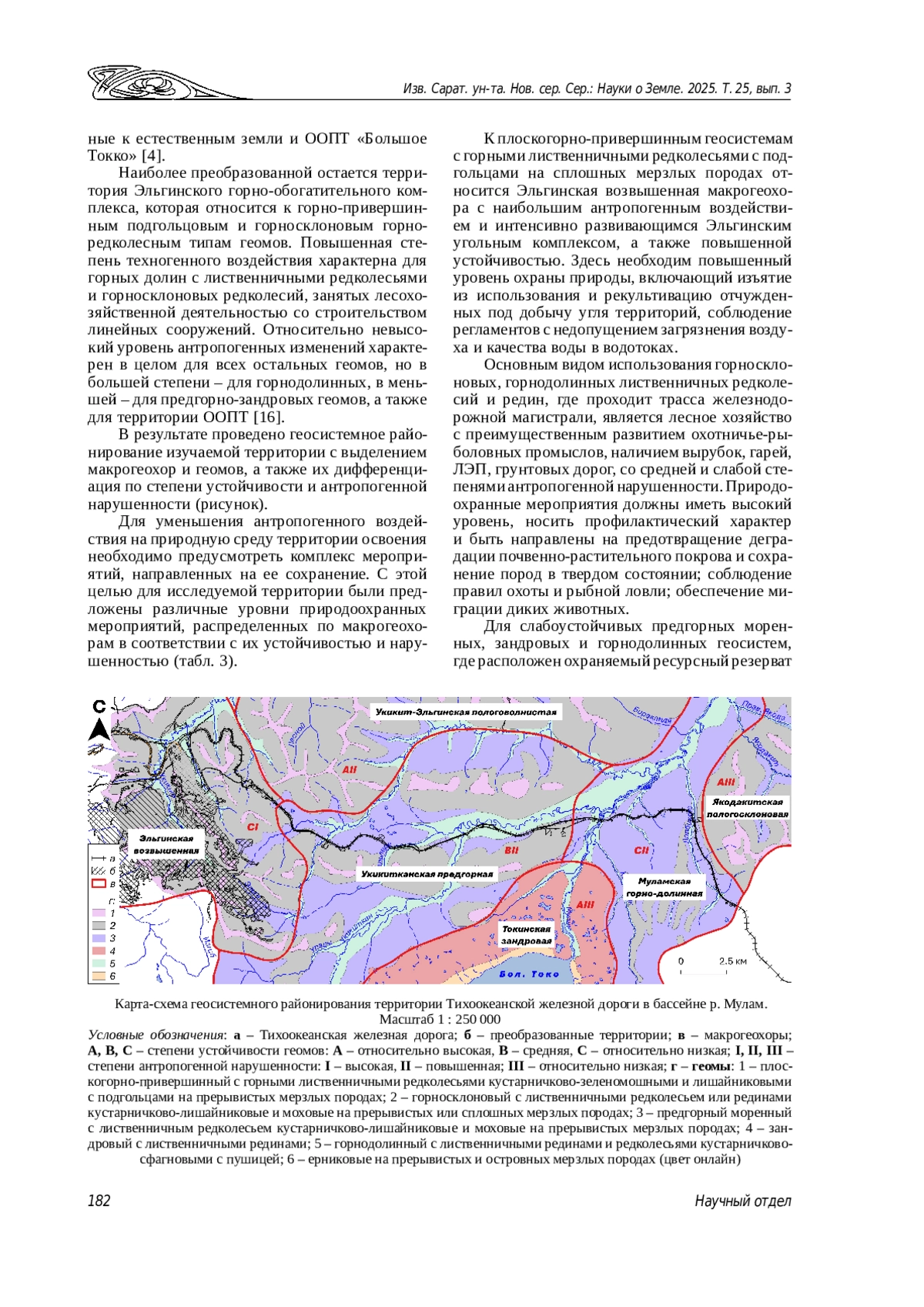 В статье рассмотрены экологические аспекты природной среды территории прохождения трассы Тихоокеанской железной дороги в пределах бассейна р. Мулам. Проект имеет особую актуальность для транспортно-логистического обеспечения добычи минерально-сырьевых ресурсов и увеличения экспорта высококачественного угля с Эльгинского угольного месторождения в Южной Якутии в страны Восточной и Юго-Восточной Азии. Трасса дороги в пределах Республики Саха (Якутия) расположена в труднодоступной необжитой территории с недостаточно изученными мерзлотными ландшафтами. Освоение этой территории включает в себя экологические риски, обусловленные низкой устойчивостью мерзлотных природных геосистем к техногенным нарушениям. По комплексу литогенных мерзлотных факторов проведена дифференциация исследуемой территории по степени их устойчивости. Установлено, что исследуемые геосистемы в зависимости от их природной структуры обладают различными степенями устойчивости. Оценена антропогенная нарушенность геосистем, обусловленная различным характером и интенсивностью хозяйственного использования с выделением районов с различной степенью антропогенного нарушения. Составлена карта-схема макрогеохор, находящихся вблизи зоны воздействия Тихоокеанской железной дороги, дифференцированных по различным уровням природоохранных мероприятий.