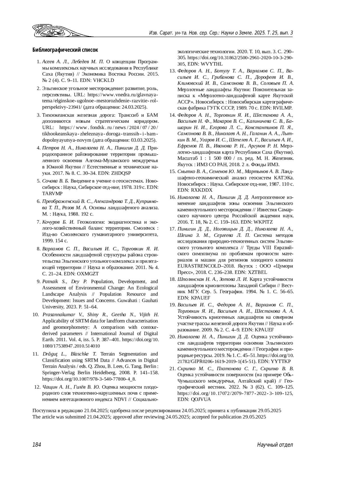 8. Варламов С. П., Васильев И. С., Торговкин Я. И. Особенности ландшафтной структуры района строительства Эльгинского угольного комплекса и прилегающей территории // Наука и образование. 2011. № 4. С. 21-24. EDN: OXMGZT