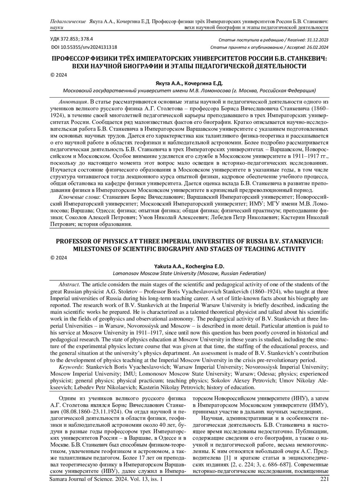 В статье рассматриваются основные этапы научной и педагогической деятельности одного из учеников великого русского физика А. Г. Столетова - профессора Бориса Вячеславовича Станкевича (1860-1924), в течение своей многолетней педагогической карьеры преподававшего в трех Императорских университетах России. Сообщается ряд малоизвестных фактов его биографии. Кратко описывается научно-исследовательская работа Б. В. Станкевича в Императорском Варшавском университете с указанием подготовленных им основных научных трудов. Дается его характеристика как талантливого физика-теоретика и рассказывается о его научной работе в областях геофизики и наблюдательной астрономии. Более подробно рассматривается педагогическая деятельность Б. В. Станкевича в трех Императорских университетах - Варшавском, Новороссийском и Московском. Особое внимание уделяется его службе в Московском университете в 1911-1917 гг., поскольку до настоящего момента этот вопрос мало освещен в историко-педагогических исследованиях. Изучается состояние физического образования в Московском университете в указанные годы, в том числе структура читавшегося тогда лекционного курса опытной физики, кадровое обеспечение учебного процесса, общая обстановка на кафедре физики университета. Дается оценка вклада Б. В. Станкевича в развитие преподавания физики в Императорском Московском университете в кризисный предреволюционный период.
