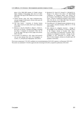 8. 	Pierson T., Major J., Amigo Á., Moreno H. Acute sedimentation response to rainfall following the explosive phase of the 2008-2009 eruption of Chaitén volcano, Chile // Bulletin of Volcanology. 2013. Vol. 75. P. 5075- 5094. ,. DOI: 10.1007/s00445-013-0723-4 EDN: DXVUGL