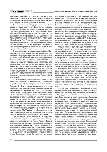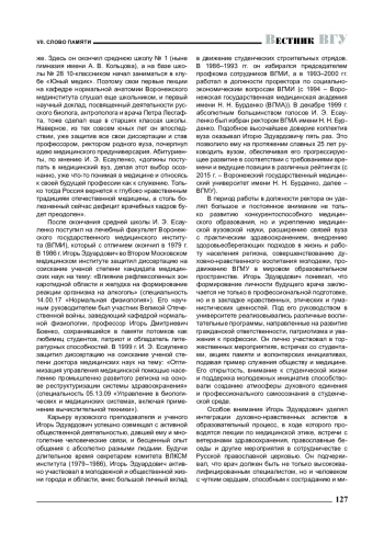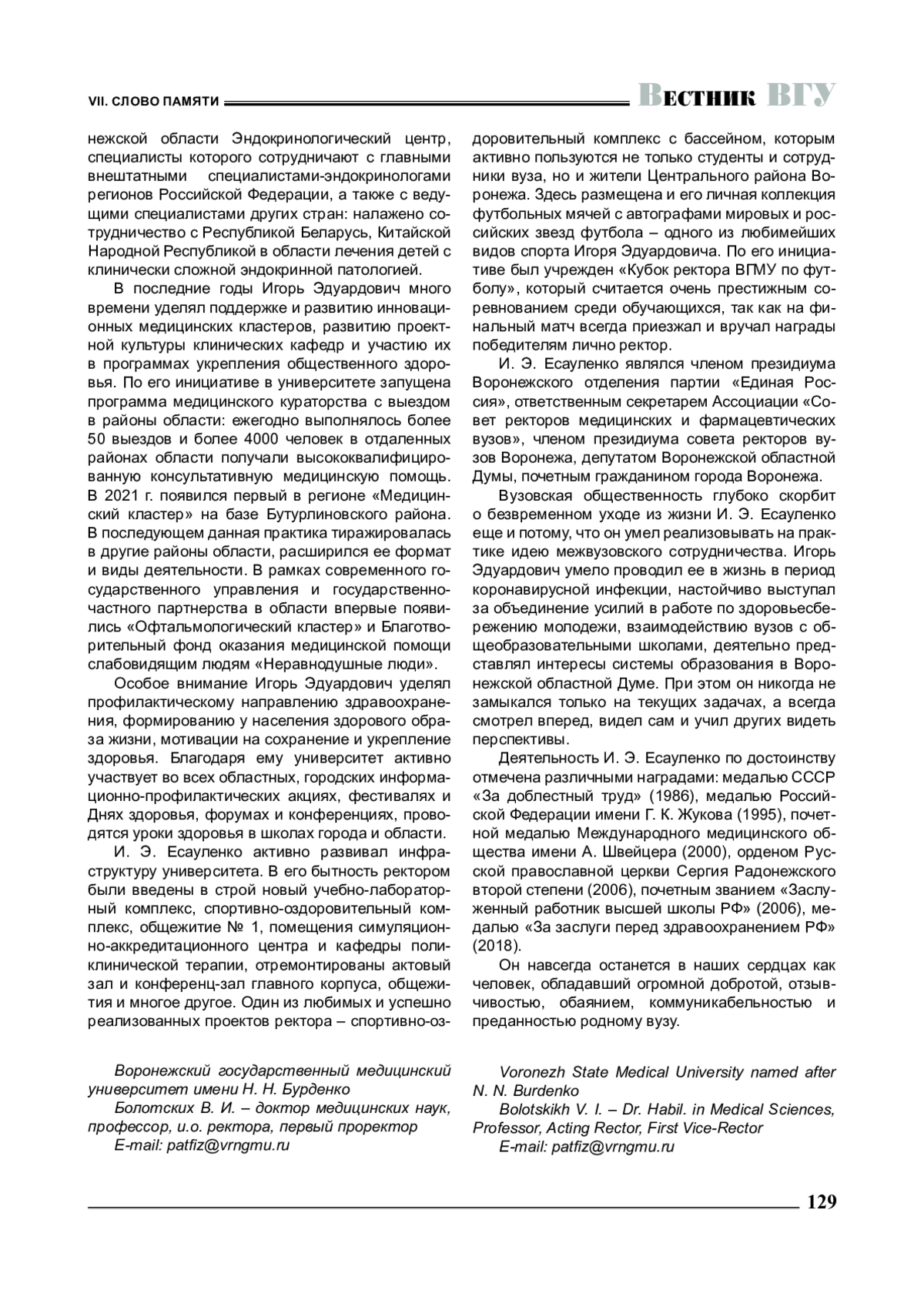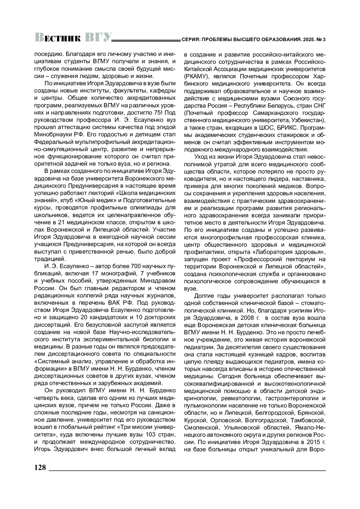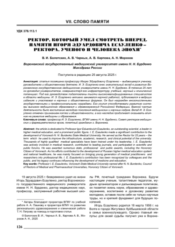 Статья посвящена профессору Игорю Эдуардовичу Есауленко - выдающемуся ученому, руководителю и общественному деятелю. И. Э. Есауленко внес значительный вклад в развитие Воронежского государственного медицинского университета имени Н. Н. Бурденко. В течение 25 лет он руководил университетом, совершенствуя его инфраструктуру, учебный, научный и клинический потенциал. Под его руководством подготовлены тысячи высококвалифицированных специалистов в области медицины. И. Э. Есауленко активно занимался научной работой, публиковался в ведущих изданиях и участвовал в научных и общественных форумах. Он был награжден многочисленными государственными и профессиональными наградами. Его усилия способствовали развитию системы высшего медицинского образования и здравоохранения Российской Федерации. Важной частью деятельности было воспитание молодого поколения медицинских и научных кадров. Вклад И. Э. Есауленко отмечен признанием коллег и общественности, а его наследие продолжает оказывать влияние на развитие медицины и образования.