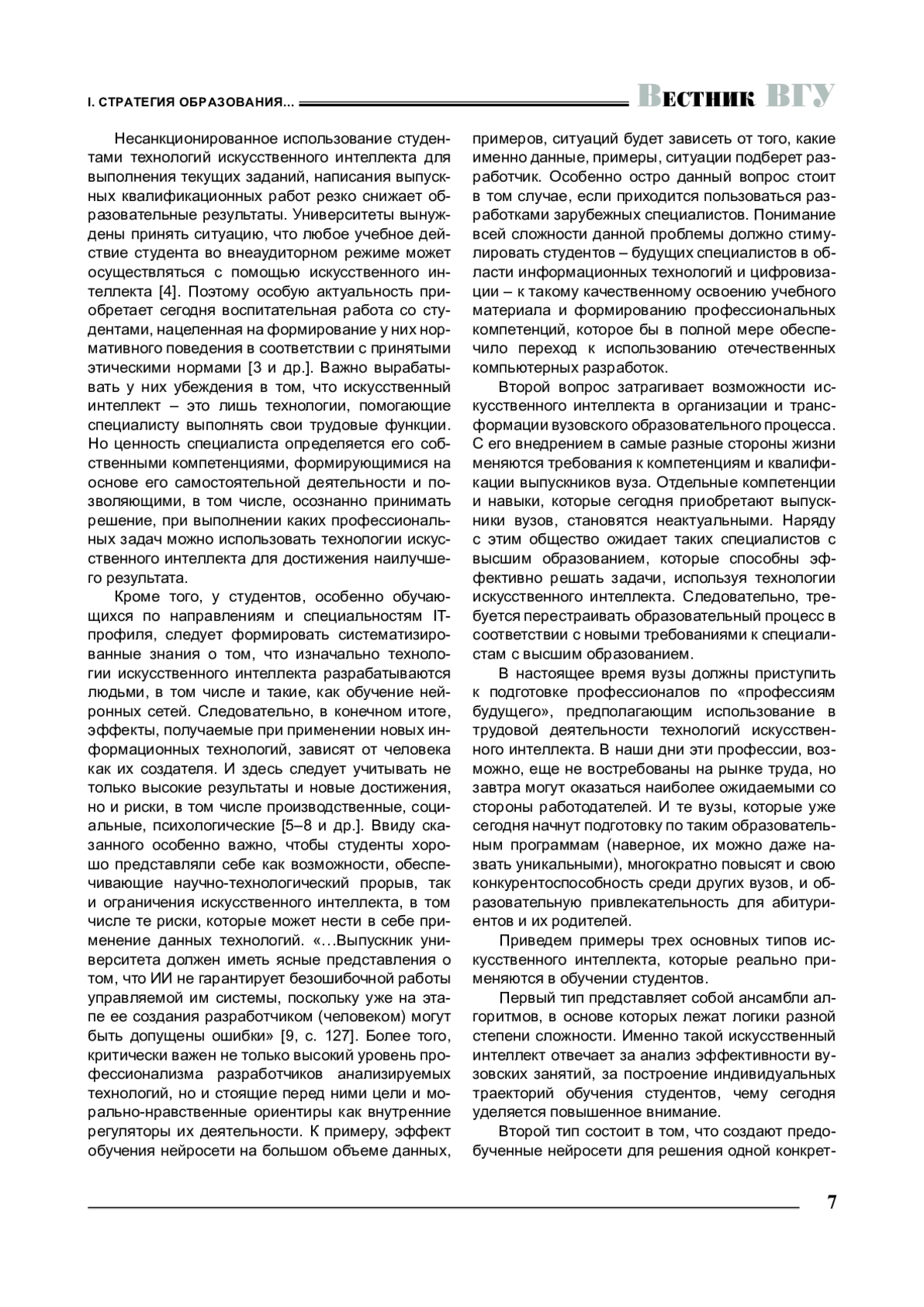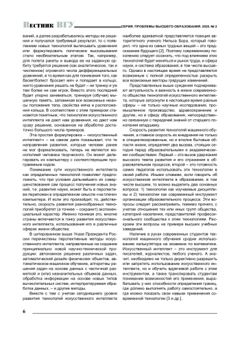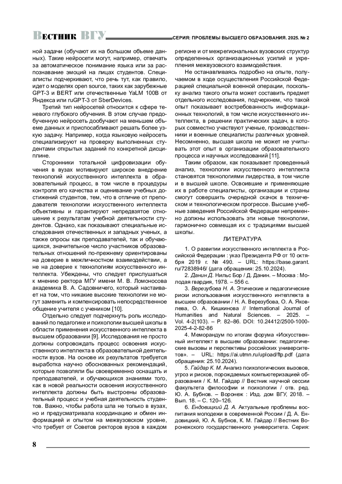 3. 	Верезубова Н. А. Этические и педагогические риски использования искусственного интеллекта в высшем образовании / Н. А. Верезубова, О. А. Яковлева, О. А. Кишкинова // International Journal of Humanities and Natural Sciences. - 2025. -Vol. 4-2(103). - P. 82-86. DOI: 10.24412/2500-10002025-4-2-82-86