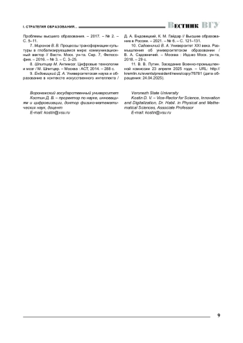 9. 	Ендовицкий Д. А. Университетская наука и образование в контексте искусственного интеллекта /Д. А. Ендовицкий, К. М. Гайдар // Высшее образование в России. - 2021. - № 6. - С. 121-131. EDN: NJJXGQ