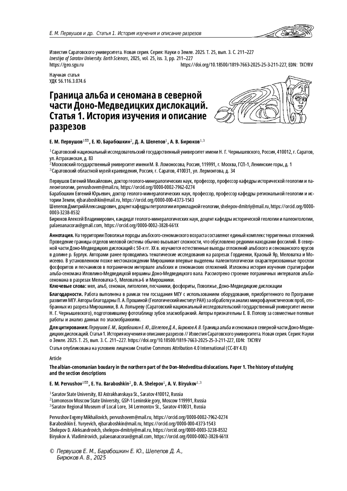 63. 	Первушов Е. М. Биогенная составляющая фосфоритового горизонта среднего турона в разрезе Сеноманская стенка. Статья 1. Материал и палеоэкологический анализ // Известия Саратовского университета. Новая серия. Серия: Науки о Земле. 2022. Т. 22, вып. 4. С. 268-282. ,. DOI: 10.18500/1819-7663-2022-22-4-268-282 EDN: GCBTJW