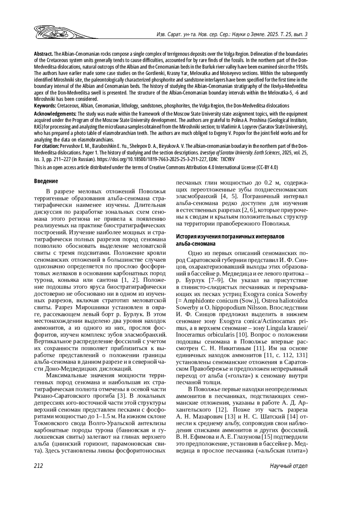 На территории Поволжья породы альбского-сеноманского возраста составляют единый комплекс терригенных отложений. Проведение границы отделов меловой системы обычно вызывает сложности, что обусловлено редкими находками фоссилий. В северной части Доно-Медведицких дислокаций с 50-х гг. XX в. изучаются естественные выходы отложений альбского и сеноманского ярусов в долине р. Бурлук. Авторами ранее проводились тематические исследования на разрезах Гордиенки, Красный Яр, Меловатка и Моисеево. В установленном позже местонахождении Мирошники впервые выделены палеонтологически охарактеризованные прослои фосфоритов и песчаников в пограничном интервале альбских и сеноманских отложений. Изложена история изучения стратиграфии альба-сеномана Иловлино-Медведицкой вершины Доно-Медведицкого вала. Рассмотрено строение пограничных интервалов альбасеномана в разрезах Меловатка-5, Меловатка-6 и Мирошники.
