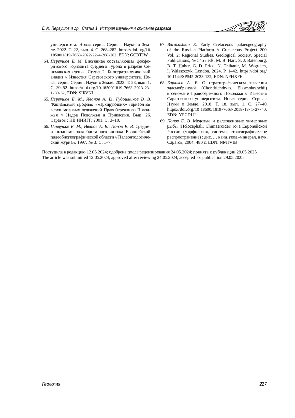 64. 	Первушов Е. М. Биогенная составляющая фосфоритового горизонта среднего турона в разрезе Сеноманская стенка. Статья 2. Биостратиномический анализ // Известия Саратовского университета. Новая серия. Серия: Науки о Земле. 2023. Т. 23, вып. 1. С. 39-52. ,. DOI: 10.18500/1819-7663-2023-23-1-39-52 EDN: SIRVNL