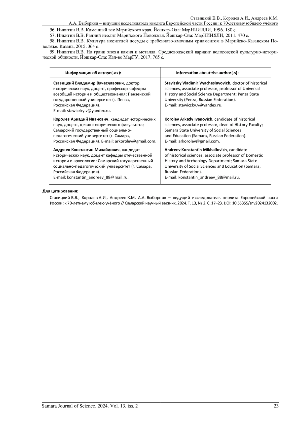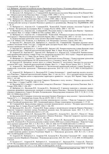 54. 	Андреев К.М., Выборнов А.А., Андреева О.В., Кулькова М.А. Поселение Сокольный VIII - новая стоянка позднего неолита Марийского Поволжья // Поволжская археология. 2023. № 3 (45). С. 8-24. DOI: 10.24852/pa2023.3.45.8.24 EDN: HRAVRS