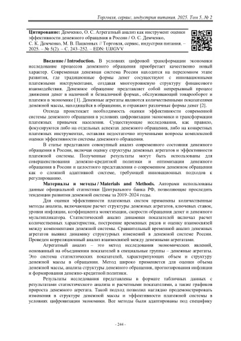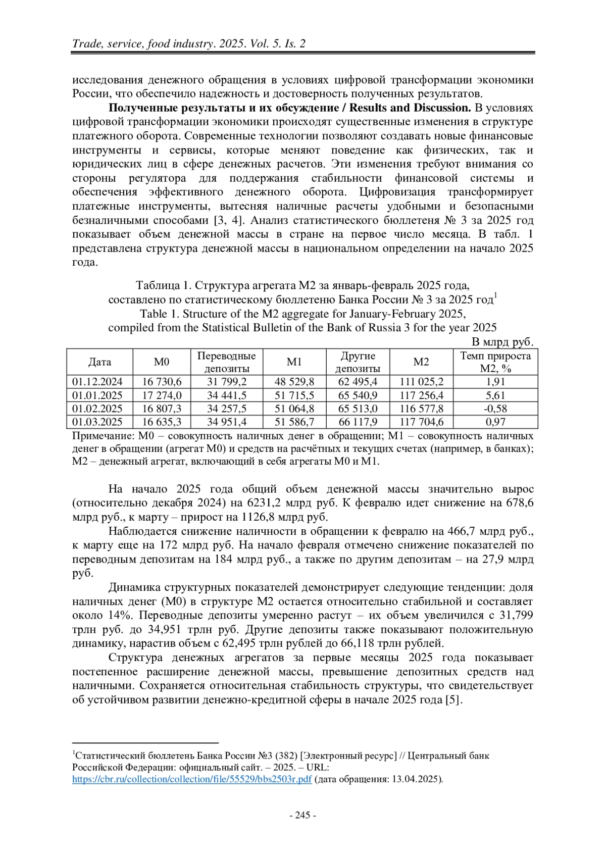 В условиях цифровой трансформации экономики исследование процессов денежного обращения приобретает качественно новый характер. Современная денежная система России находится на переломном этапе развития, где традиционные формы денег сосуществуют с инновационными платежными инструментами, создавая многоуровневую структуру финансового взаимодействия. Денежное обращение представляет собой непрерывный процесс движения денег в наличной и безналичной формах, обслуживающий товарооборот и платежи в экономике [1]. Денежные агрегаты являются количественными показателями денежной массы, находящейся в обращении, и отражают различные формы денег [2].
