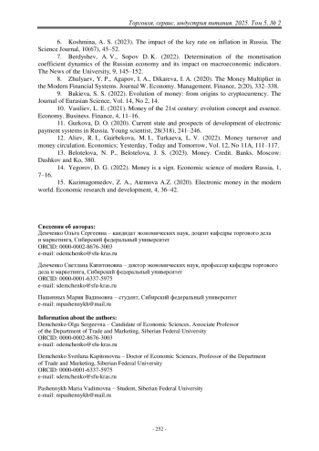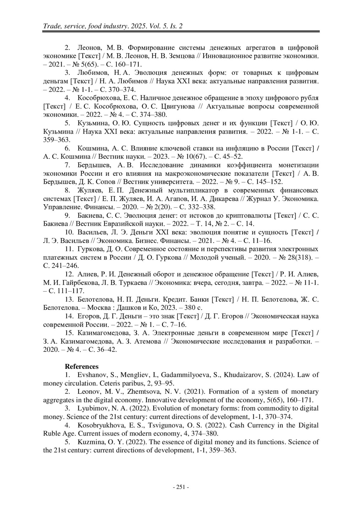 7. Бердышев, А. В. Исследование динамики коэффициента монетизации экономики России и его влияния на макроэкономические показатели [Текст] / А. В. Бердышев, Д. К. Сопов // Вестник университета. – 2022. – № 9. – С. 145–152.