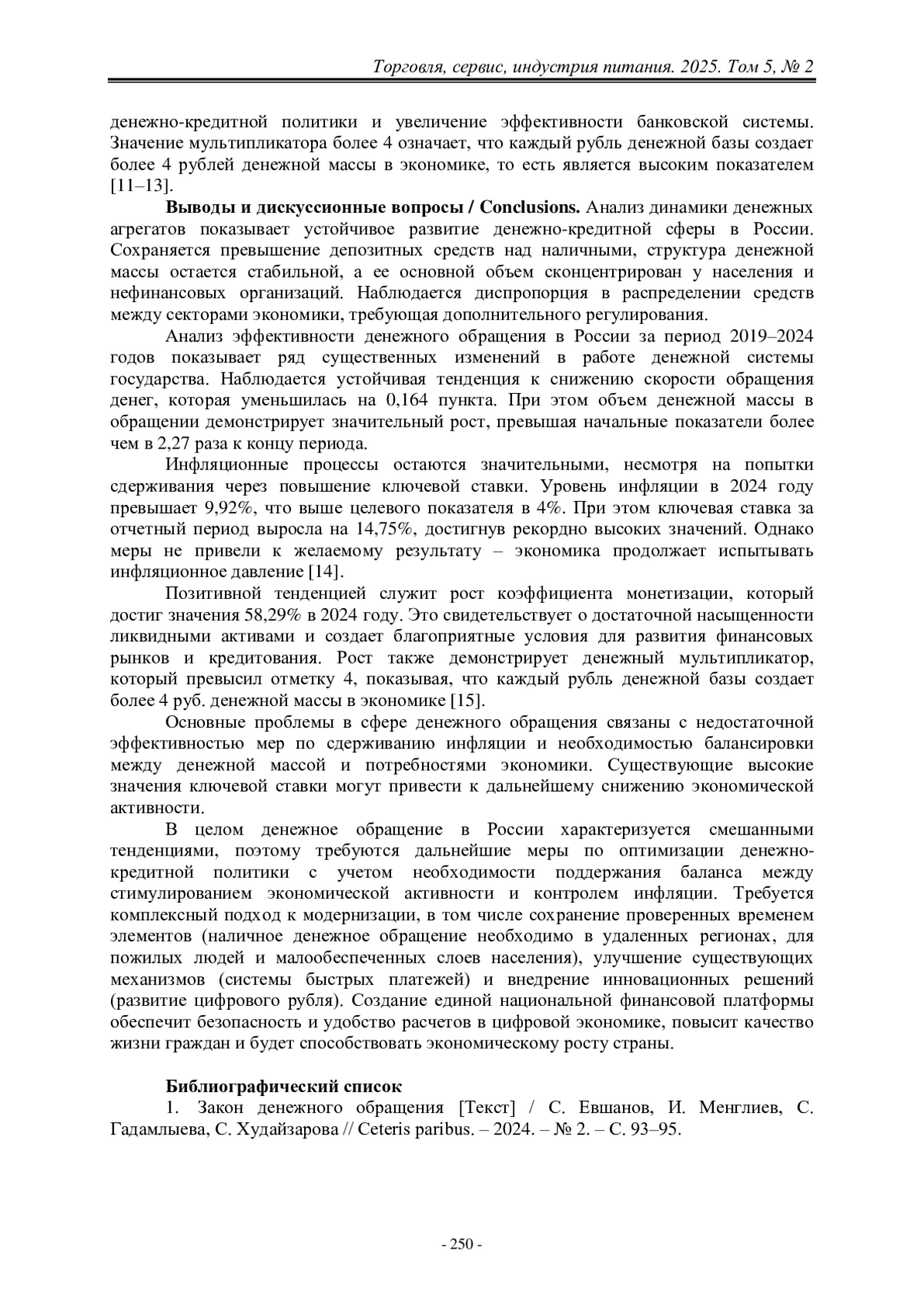 Выявлена неравномерная структура распределения денежной массы между экономическими секторами с доминирующим вкладом домохозяйств и значимой ролью нефинансовых организаций, что указывает на необходимость совершенствования финансового посредничества. Анализ показал сокращение валютных депозитов, свидетельствующее об укреплении курса рубля и росте доверия к национальной валюте. Выявлен рост денежной массы и повышение уровня монетизации в сочетании со снижением скорости обращения денег и сохранением высокой инфляции при повышенных ставках. Дана оценка эффективности банковской системы через денежный мультипликатор и выявлена необходимость балансировки денежной массы с экономическими потребностями при недостаточной результативности антиинфляционных мер.