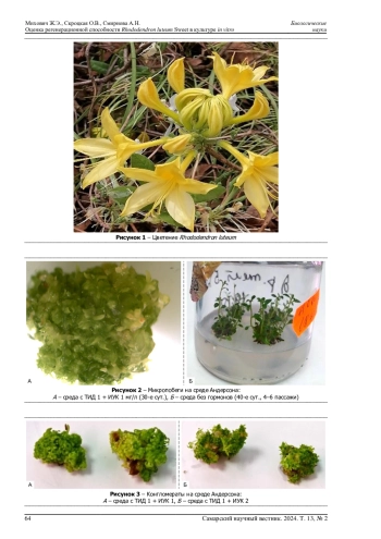 Rhododendron luteum (рододендрон желтый) - листопадный кустарник, получивший широкое распространение в садово-парковом строительстве благодаря высоким декоративным качествам. В Ботанический сад Института биологии Коми НЦ УрО РАН Rh. luteum привлечен пятилетними саженцами в 2008 г. из Ботанического сада-института ПГТУ (г. Йошкар-Ола). Установлено, что в условиях среднетаежной подзоны Республики Коми размножение Rh. luteum и семенным, и вегетативным путем затруднено в связи с нерегулярным формированием фертильных семян и слабым линейным ростом побегов. Однако, учитывая высокие декоративные качества Rh. luteum в сочетании с достаточной неприхотливостью к условиям выращивания, представляется актуальным продолжение разработки способов его репродукции в условиях Севера. Поэтому целесообразно было оценить регенерационную способность Rh. luteum в культуре in vitro. На этапе собственно микроразмножения Rh. luteum под действием тидиазурона в течение 6 пассажей наблюдалась активная пролиферация почек и регенерация побегов, при неизменном типе органогенеза (активация меристем). Элонгация побегов достигалась на безгормональной среде Андерсона. В результате оценки влияния двух модифицированных питательных сред (Андерсона и WPM) на морфогенез было показано, что обе питательные среды положительно влияют на темпы роста и развития побегов. Наибольший коэффициент размножения получен на модифицированной среде Андерсона в присутствии БАП 0,5 + ИУК 0,5 мг/л на последействии тидиазурона.