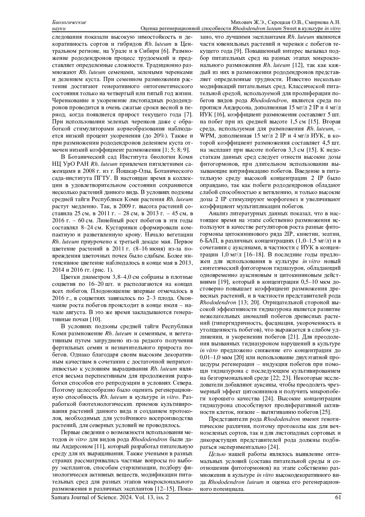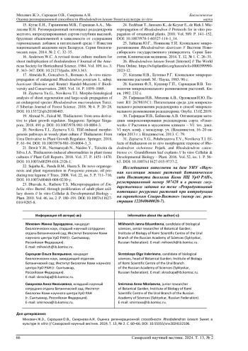 18. 	Zaytseva Yu.G., Novikova T.I. Morpho-histological analysis of shoot regeneration and large-scale propagation of an endangered species Rhododendron mucronulatum Turcz. // Siberian Journal of Forest Science. 2018. № 4. P. 20-28. DOI: 10.15372/sjfs20180403 EDN: XWPKPB