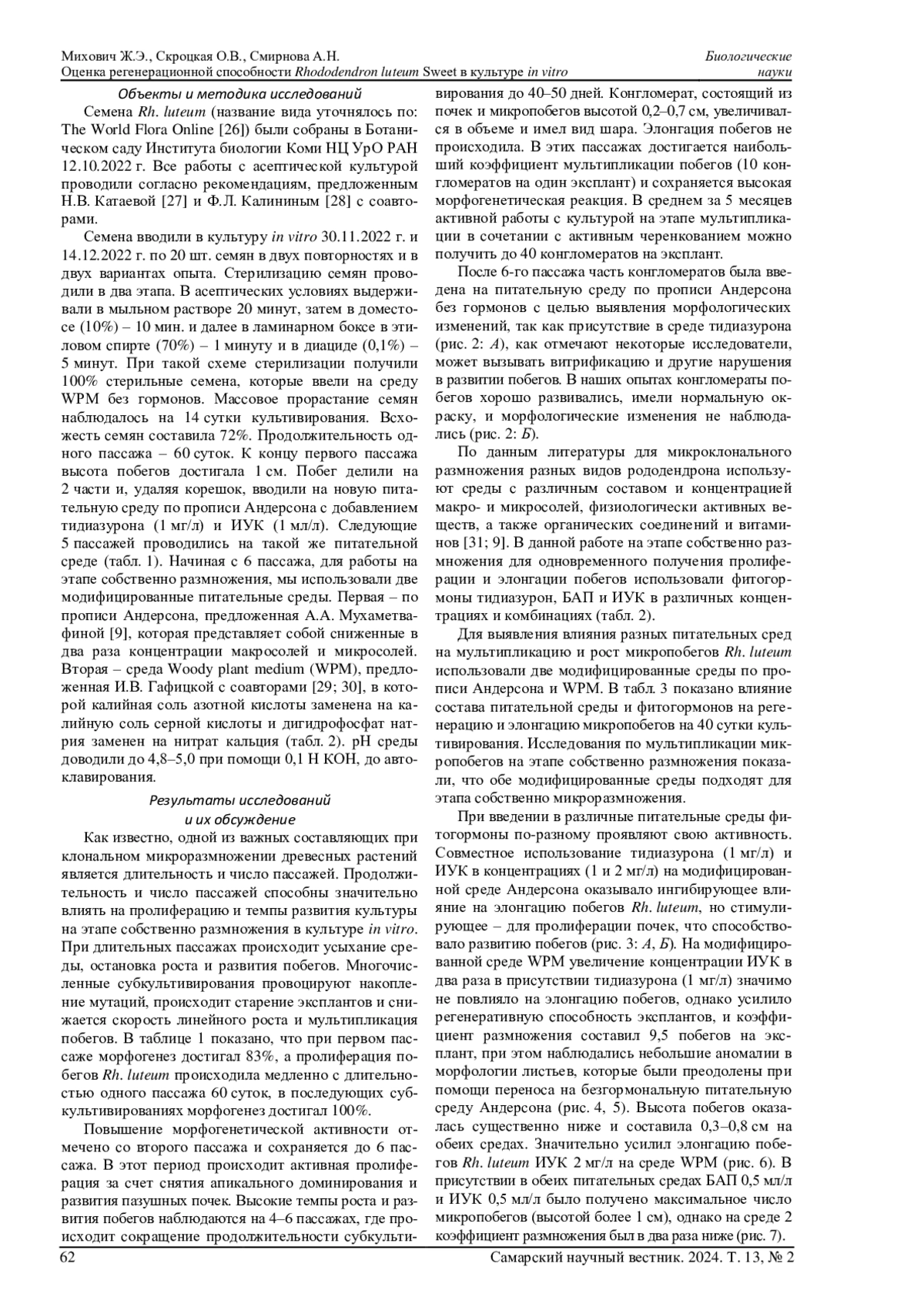 31. 	Zaytseva Y.G., Poluboyarova T.V., Novikova T.I. Effects of thidiazuron on in vitro morphogenic response of Rhododendron sichotense Pojark. and Rhododendron catawbiense cv. Grandiflorum leaf explants // In vitro Cellular & Developmental Biology - Plant. 2016. Vol. 52, iss. 1. P. 56-63. DOI: 10.1007/s11627-015-9737-2 EDN: WQDCZB