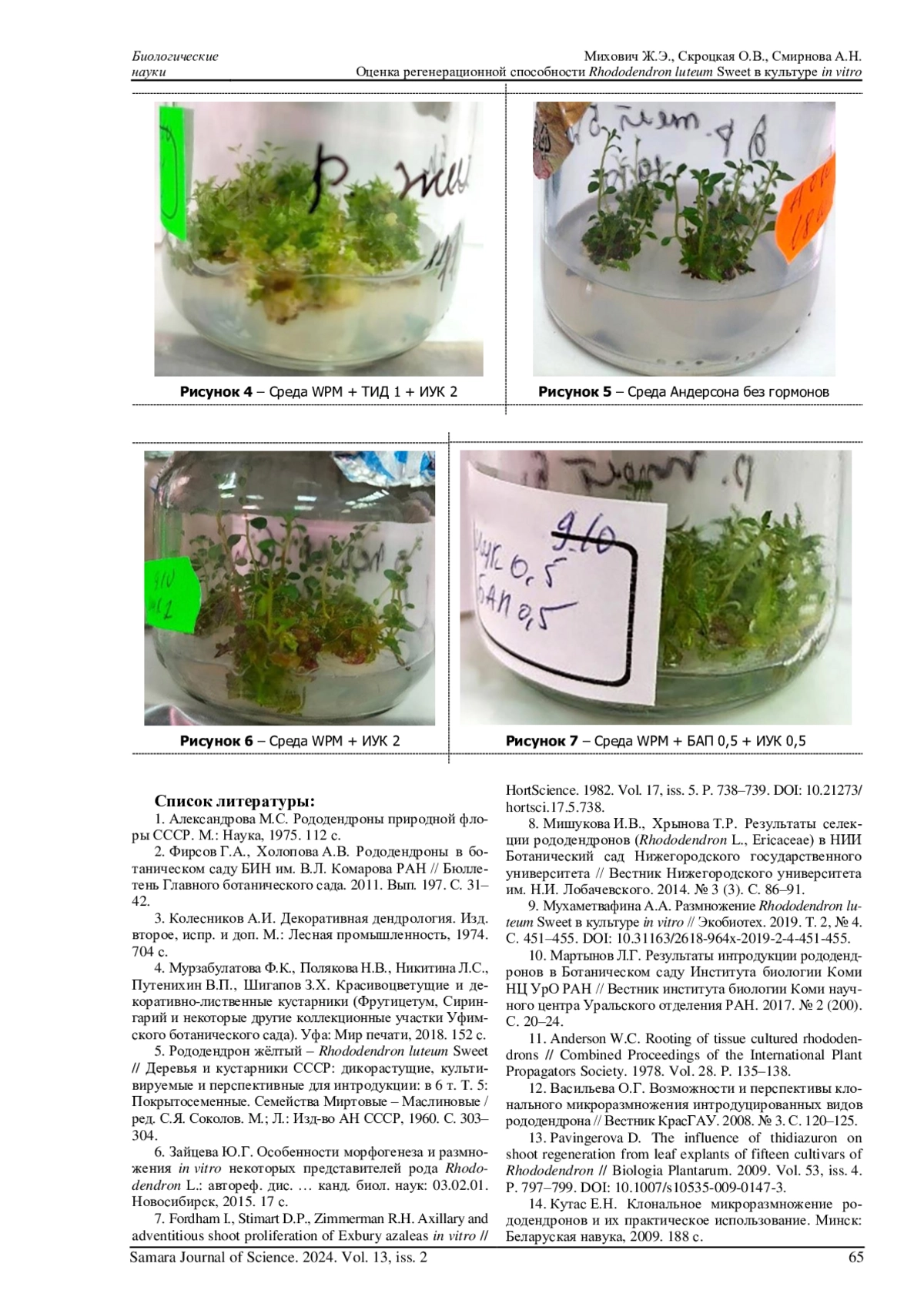 13. 	Pavingerova D. The influence of thidiazuron on shoot regeneration from leaf explants of fifteen cultivars of Rhododendron // Biologia Plantarum. 2009. Vol. 53, iss. 4. P. 797-799. DOI: 10.1007/s10535-009-0147-3