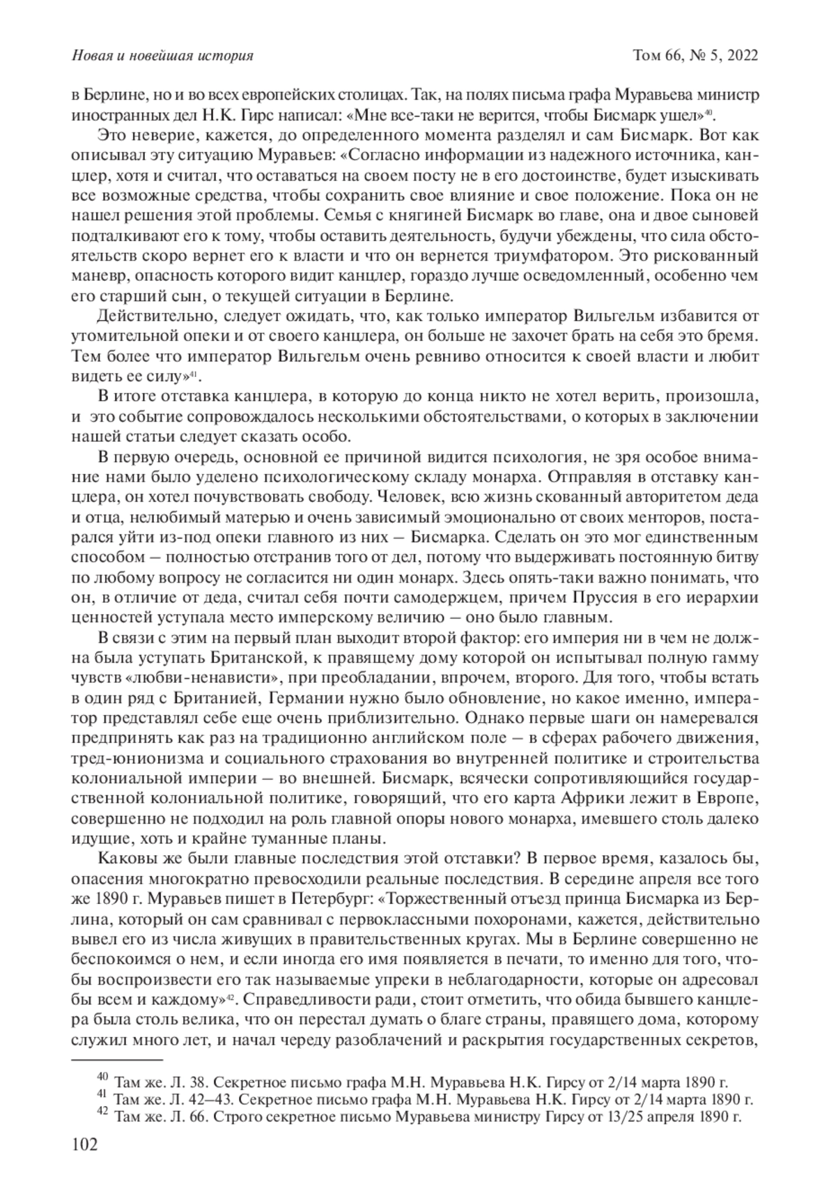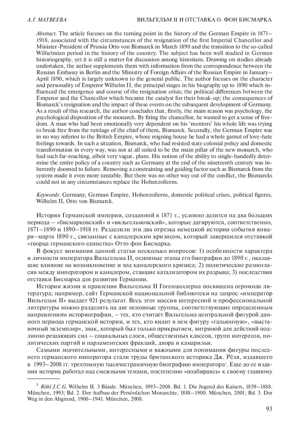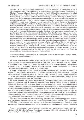 Статья посвящена переломному моменту в истории Германской империи 1871– 1918 гг., связанному с обстоятельствами отставки первого имперского канцлера и министра-президента Пруссии О. фон Бисмарка в марте 1890 г. и переходу к так называемому вильгельмовскому периоду в истории страны. Несмотря на высокую степень изученности данной темы, преимущественно в немецкой историографии, она остается предметом дискуссии историков и по сей день. Опираясь на уже существующие исследования, автор статьи дополняет их информацией, содержащейся в переписке российского посольства в Берлине с Министерством иностранных дел Российской империи за январь–апрель 1890 г., практически незнакомой широкому читателю. В фокусе интереса автора статьи находятся особенности характера и личности императора Вильгельма II, основные этапы его биографии до 1890 г., оказавшие влияние на возникновение и ход канцлерского кризиса; политические разногласия между императором и канцлером, ставшие катализатором их разрыва; последствия отставки Бисмарка и воздействие этих событий на последующее развитие Германии. В результате исследования автор приходит к следующим выводам. Во-первых, основной причиной отставки канцлера был психологический склад монарха, желающего почувствовать свободу. Человек, всю жизнь очень зависимый эмоционально от своих менторов, постарался уйти из-под опеки главного из них – Бисмарка. Во-вторых, Германская империя ни в чем не должна была уступать Британской, к правящему дому которой Вильгельм испытывал полную гамму чувств «любви-ненависти». И в этой ситуации Бисмарк, всячески сопротивляющийся государственной колониальной политике и внутриполитической трансформации, совершенно не подходил на роль главной опоры нового монарха, имевшего далеко идущие, хоть и крайне туманные, планы. Его идея о принципиальной возможности в конце XIX в. единолично определять всю политику такой страны, как Германия, была изначально обречена на провал. Исключение из системы такого сдерживающего и направляющего фактора, как Бисмарк, сделало ее еще более неустойчивой. Впрочем, иного выхода из конфликта и не могло быть, и 1890 г. знаменовал собой начало нового этапа в истории страны.