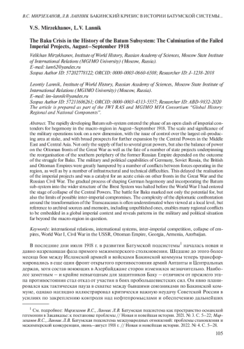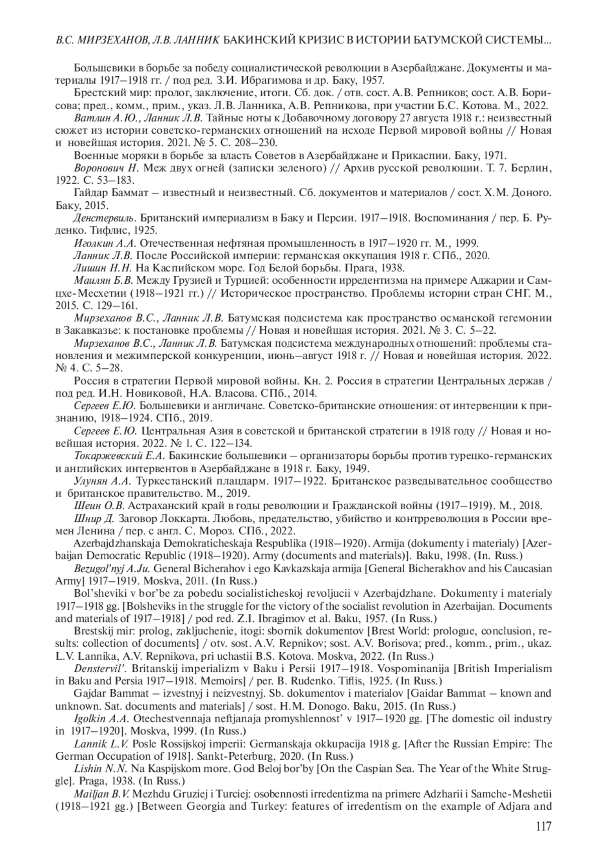 15. 	Мирзеханов В.С., Ланник Л.В. Батумская подсистема международных отношений: проблемы становления и межимперской конкуренции, июнь-август 1918 г. // Новая и новейшая история. 2022. № 4. С. 5-28. EDN: STVCFE