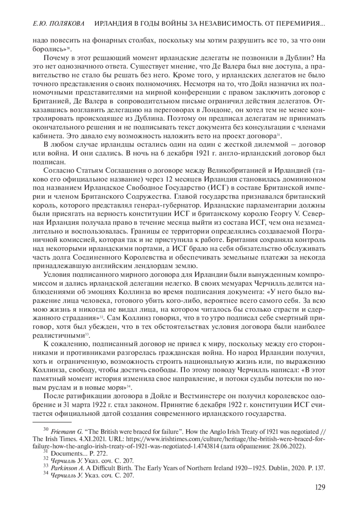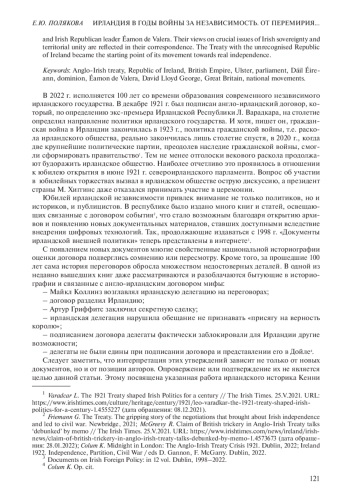 5. 	Friemann G. “The British were braced for failure”. How the Anglo Irish Treaty of 1921 was negotiated // The Irish Times. 4.ХI.2021. URL: https://www.irishtimes.com/culture/heritage/the-british-were-braced-for-failure-how-the-anglo-irish-treaty-of-1921-was-negotiated-1.4743814 (access date: 24.01.2022).