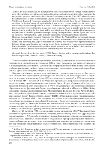 В статье на основе материалов из архива МИД Франции, большая часть из которых до сих пор не была введена в научный оборот, рассматриваются подготовка, ход и итоги советско-французской конференции 1926–1927 гг., в рамках которой обсуждался вопрос выплаты долгов Российской империи. Французские документы показывают, что советская сторона с самого начала обозначила, что вопрос выплаты царских долгов для нее в силу экономического положения в стране неразрывно связан с предоставлением кредитов. Французская делегация, хотя и не признавала связи между двумя этими вопросами, была готова обсуждать их параллельно и показывала реальную заинтересованность и в урегулировании долгового вопроса, и в предоставлении кредитов. Несмотря на значительные разногласия, позиции делегаций в ходе переговоров постепенно сближались, были согласованы конкретные цифры и детали по ключевым вопросам, достижение взаимоприемлемого результата казалось вполне возможным. Активным сторонником достижения договоренностей с Москвой был посол Франции в СССР Жан Эрбетт. Он неоднократно писал в Париж, что французской промышленности очень важен советский рынок, тем более что конкуренты Франции уже были там. Также он предполагал, что в случае успеха Парижской конференции советское государство перестало бы вести идеологическую пропаганду против Франции, как это произошло по отношению к Германии после Рапалльского договора 1922 г.