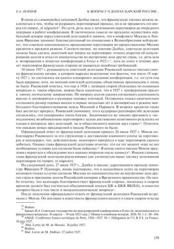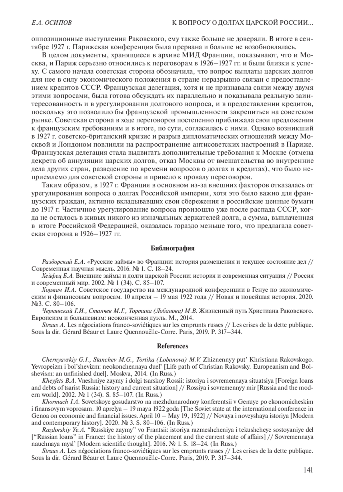 5. 	Straus A. Les négociations franco-soviétiques sur les emprunts russes // Les crises de la dette publique. Sous la dir. Gérard Béaur et Laure Quennouëlle-Corre. Paris, 2019. P. 317-344.