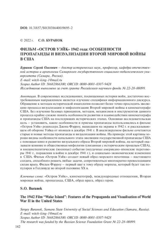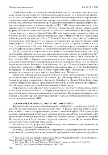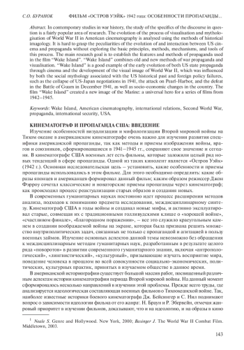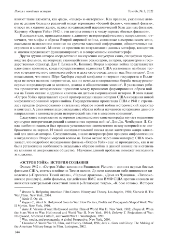 Изучение особенностей визуализации и мифологизации Второй мировой войны на Тихом океане в американском кинематографе очень важно для изучения развития специфики американской пропаганды, так как методы и приемы изображения войны, врагов и союзников, сформировавшиеся в 1941–1945 гг., сохраняют свое значение и сегодня. В кинематографе США военных лет есть фильмы, которые заложили целый ряд новых тенденций в сфере пропаганды. Одной из таких кинолент является «Остров Уэйк» (1942 г.). Основная исследовательская цель – установить, какие особенности и приемы пропаганды использовались в этом фильме. Для этого необходимо определить: какие образы японцев и американцев формировал данный фильм; каким образом режиссер Джон Фэрроу сочетал классические и новаторские приемы пропаганды через кинематограф; как происходил процесс реактуализации старых образов и создания новых