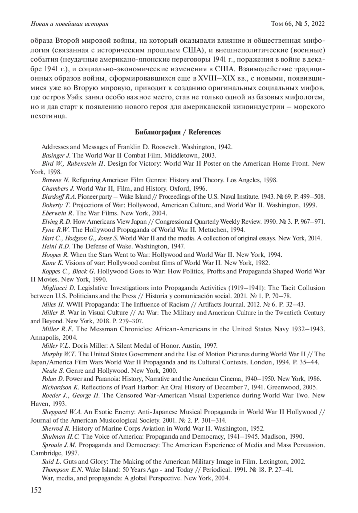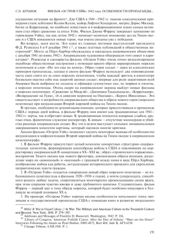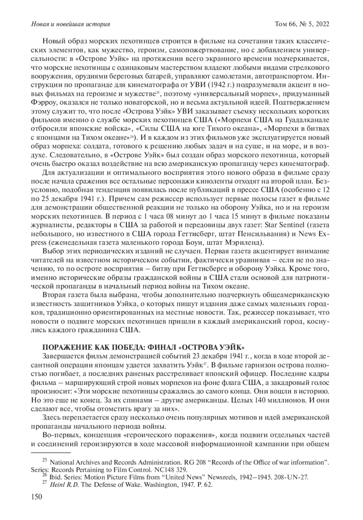 В современных исследованиях, посвященных истории войн, достаточно востребованным направлением является изучение специфики информационного дискурса. Обращение к методам исторической имагологии позволит более точно проследить эволюцию процесса визуализации и мифологизации Второй мировой войны в кинематографе США. Без изучения базовых принципов, методов, механизмов и инструментов данного процесса крайне сложно понять особенности развития и взаимодействия кинематографа и пропаганды США на последующих исторических этапах. Основная исследовательская цель – установить, какие особенности и приемы пропаганды использовались в фильме «Остров Уэйк» режиссера Джона Фэрроу, вышедшем на экраны в 1942 г. и рассказывающем об обороне Уэйка от японцев в декабре 1941 г. В анализируемом фильме сочетаются старые и новые методы пропаганды и визуализации войны. На примере этой картины хорошо видны особенности начального этапа эволюции государственной пропаганды США с помощью кино и развитие визуального образа Второй мировой войны, на который оказывали влияние и общественная мифология (связанная с историческим прошлым США), и внешнеполитические (военные) события (неудачные американо-японские переговоры 1941 г., поражения в войне в декабре 1941 г.), и социально-экономические изменения в США. Фильм «Остров Уэйк» создает новый образ морского пехотинца – настоящего солдата, способного решать любые задачи, сопротивляться многократно превосходящим силам врага. Фильм Фэрроу – первый шаг к тому образу морпеха, который будет так популярен в Голливуде во второй половине ХХ в