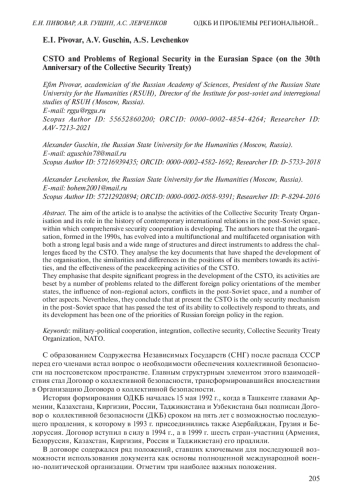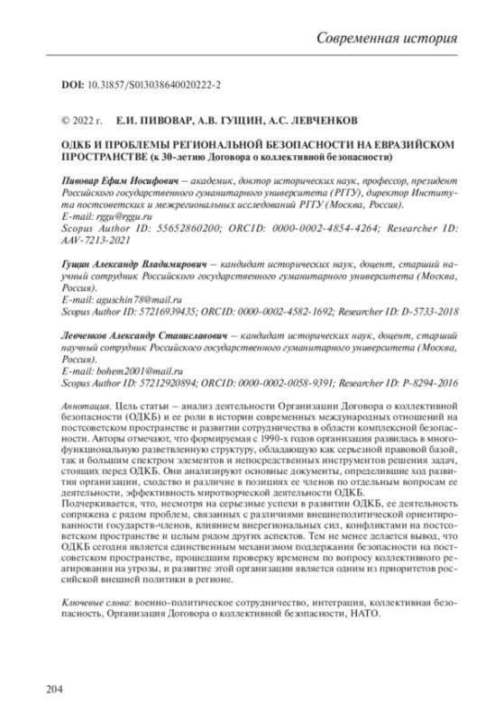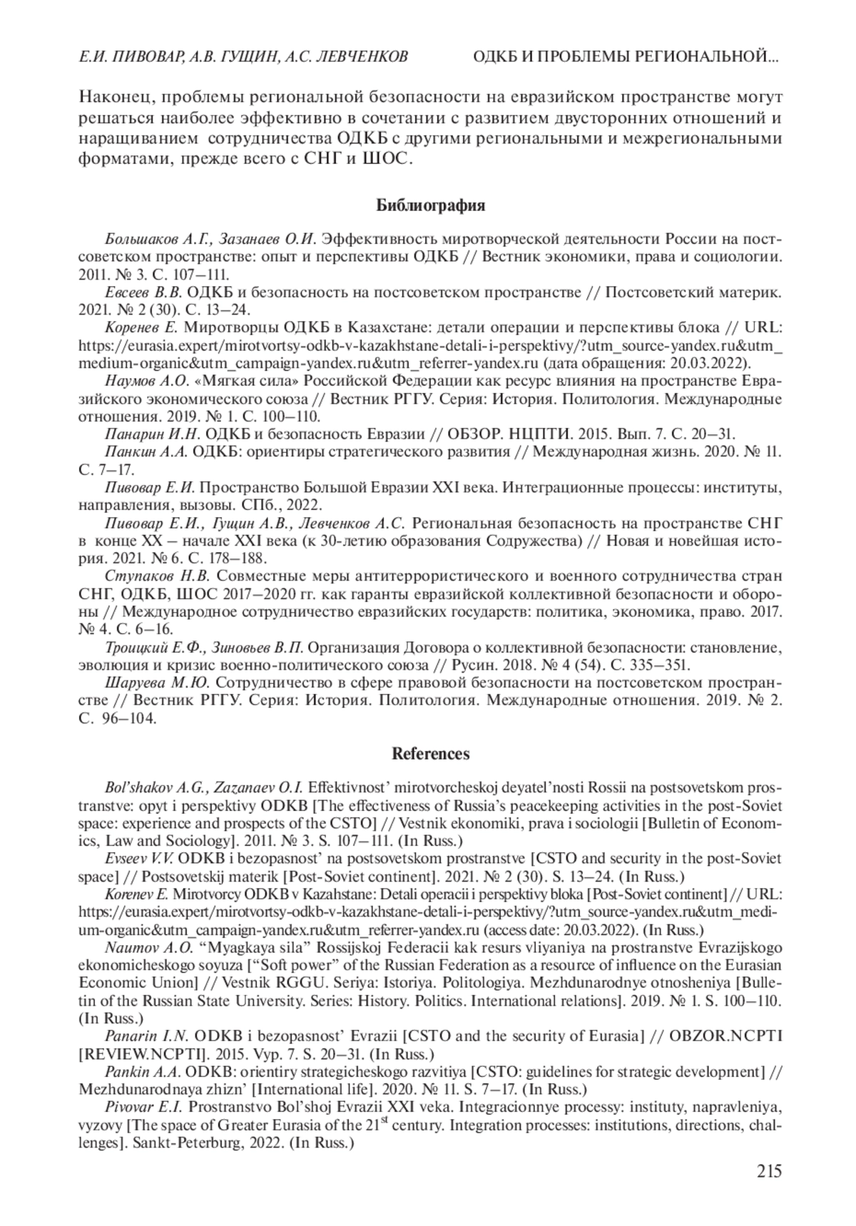 8. 	Пивовар Е.И., А.В. Гущин А.В., Левченков А.С. Региональная безопасность на пространстве СНГ в конце XX - начале XXI века (к 30-летию образования Содружества) // Новая и новейшая история. 2021. № 6. С. 178-188. EDN: MMMJSR