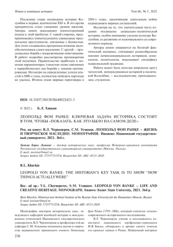 Монография докторов исторических наук, заведующего кафедрой всеобщей истории и международных отношений Ивановского государственного университета В. Л. Черноперова и профессора той же кафедры С. М. Усманова посвящена жизни и творчеству выдающегося германского ученого Леопольда фон Ранке (1795–1886), который считается «отцом» современного исторического исследования.