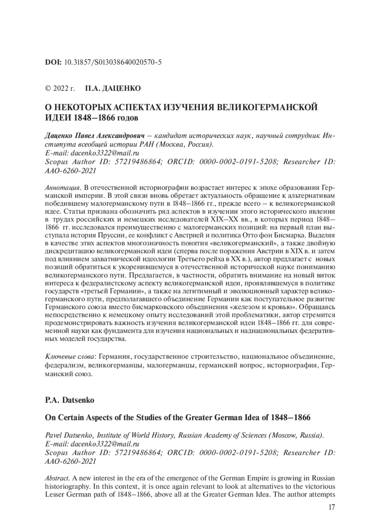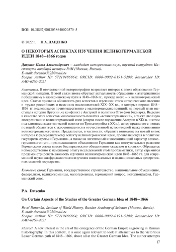 В отечественной историографии возрастает интерес к эпохе образования Германской империи. В этой связи вновь обретает актуальность обращение к альтернативам победившему малогерманскому пути в 1848–1866 гг., прежде всего – к великогерманской идее. Статья призвана обозначить ряд аспектов в изучении этого исторического явления в трудах российских и немецких исследователей XIX–XX вв., в которых период 1848– 1866 гг. исследовался преимущественно с малогерманских позиций: на первый план выступала история Пруссии, ее конфликт с Австрией и политика Отто фон Бисмарка. Выделяя в качестве этих аспектов многозначность понятия «великогерманский», а также двойную дискредитацию великогерманской идеи (сперва после поражения Австрии в XIX в. и затем под влиянием захватнической идеологии Третьего рейха в XX в.), автор предлагает с новых позиций обратиться к укоренившемуся в отечественной исторической науке пониманию великогерманского пути. Предлагается, в частности, обратить внимание на новый виток интереса к федералистскому аспекту великогерманской идеи, проявлявшемуся в политике государств «третьей Германии», а также на легитимный и эволюционный характер великогерманского пути, предполагавшего объединение Германии как поступательное развитие Германского союза вместо бисмарковского объединения «железом и кровью». Обращаясь непосредственно к немецкому опыту исследований этой проблематики, автор стремится продемонстрировать важность изучения великогерманской идеи 1848–1866 гг. для современной науки как фундамента для изучения национальных и наднациональных федеративных моделей государства.