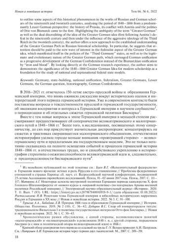 В 2016–2021 гг. отмечалось 150-летие австро-прусской войны и образования Германской империи, что вновь оживило дискуссию вокруг исторических оценок и интерпретаций этого периода германской истории. Уже в современном контексте были поставлены вопросы о тождественности прусской и германской государственности, об эволюции восприятия и интереса к Германской империи в научном сообществе 1, о периодизации и об отдельных сюжетах германской политики Бисмарка