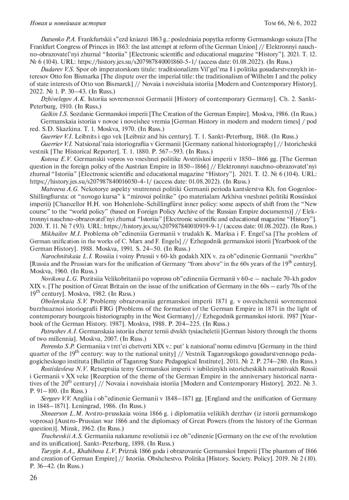 22. Турыгин А.А., Хабибова Л.В. Призрак 1866 года и образование Германской Империи // История. Общество. Политика. 2019. № 2 (10). С. 36-42. EDN: YMIGEY