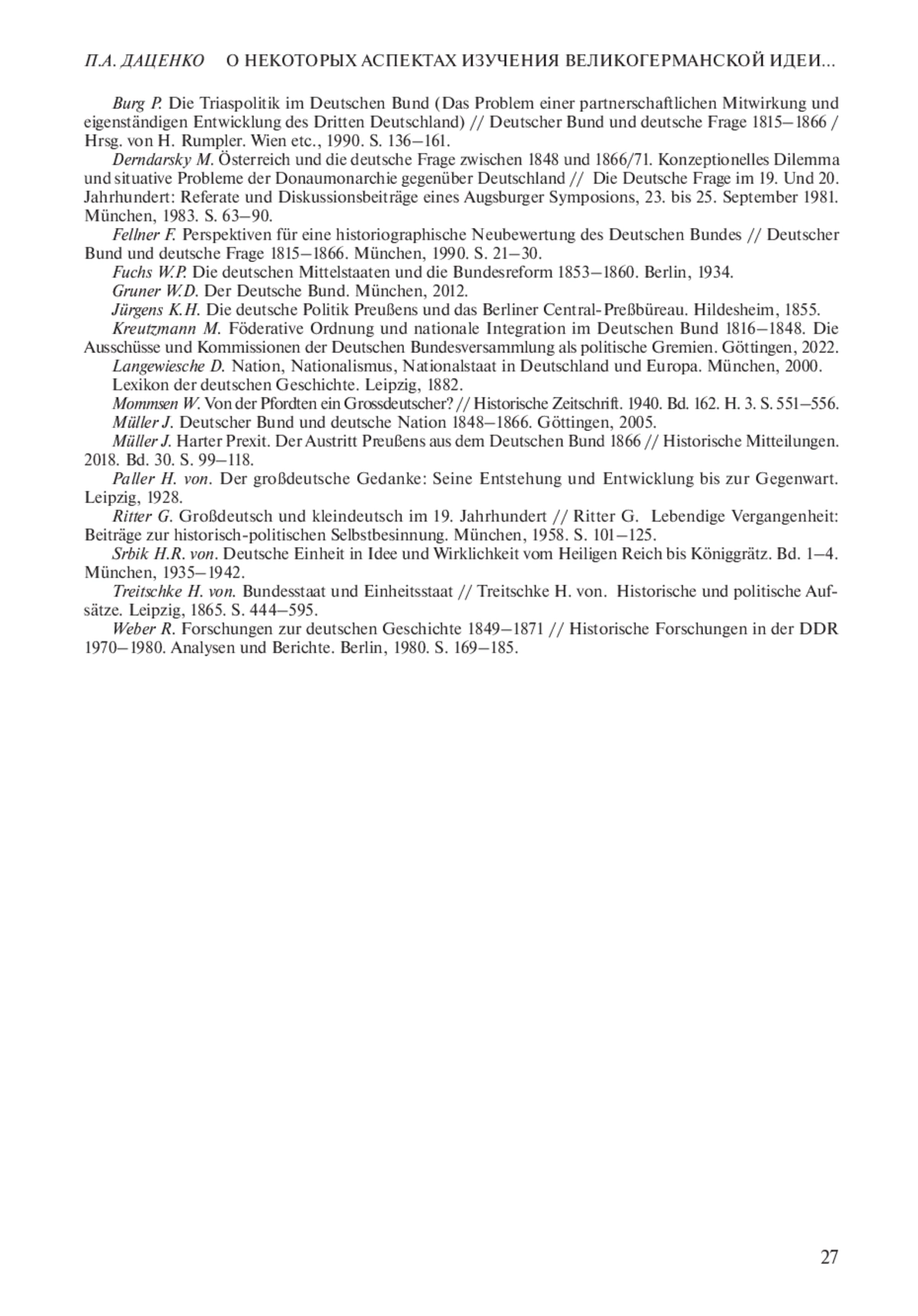 24. Burg P. Die Triaspolitik im Deutschen Bund (Das Problem einer partnerschaftlichen Mitwirkung und eigenständigen Entwicklung des Dritten Deutschland) // Deutscher Bund und deutsche Frage 1815-1866 / Hrsg. von H. Rumpler. Wien etc., 1990. S. 136-161.