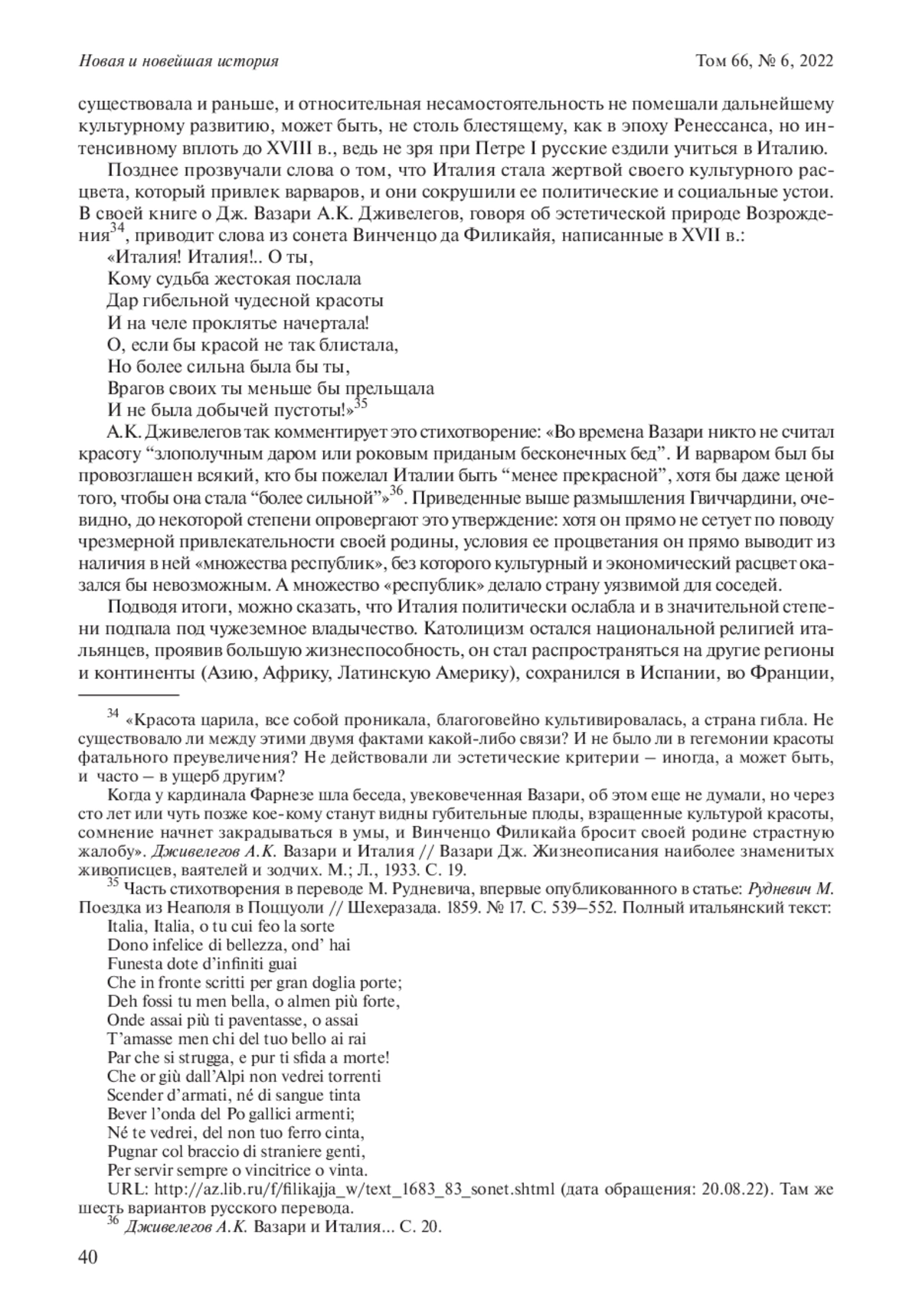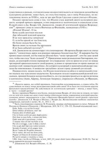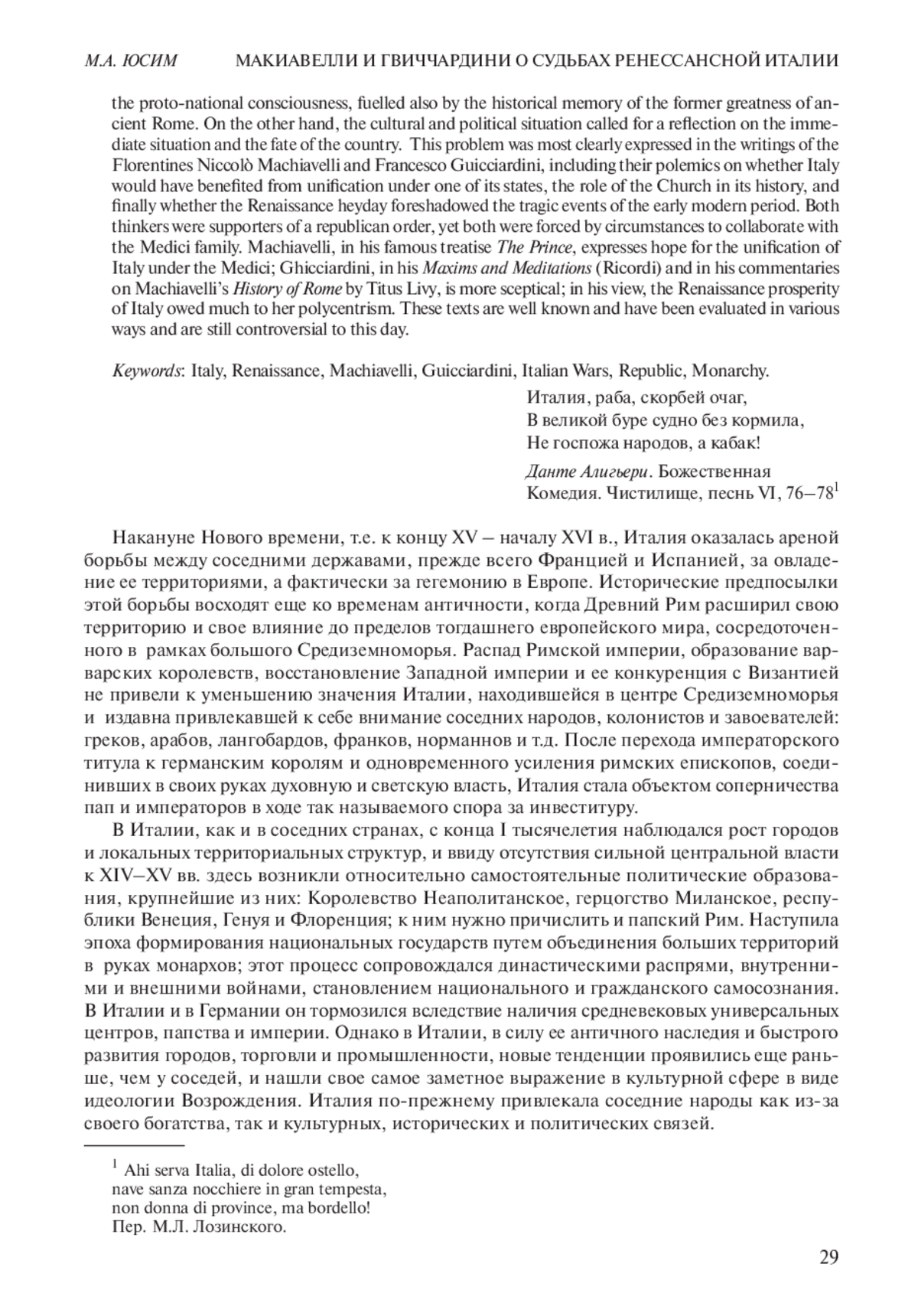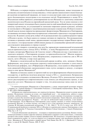 К началу XVI в. Италия была самой богатой, процветающей и передовой страной Европы, центром католического мира. Однако одновременно здесь развернулись войны соседних держав за господство на полуострове. С одной стороны, это парадоксальным образом способствовало обострению протонационального самосознания, подогреваемое и исторической памятью о былом величии Древнего Рима. С другой стороны, культурная и политическая обстановка требовала осмысления текущего момента и грядущих судеб страны. Наиболее ярко эта проблематика выразилась в сочинениях флорентинцев Никколò Макиавелли и Франческо Гвиччардини, в том числе и в их полемике по поводу того, пошло ли бы Италии на пользу объединение под эгидой одного из ее государств, какова была роль Церкви в истории страны, наконец, не предопределил ли ренессансный расцвет трагических событий начала Нового времени. Оба мыслителя были сторонниками республиканского устройства, но оба в силу обстоятельств были вынуждены сотрудничать с семейством Медичи, представители которого занимали папский трон в 20-х – начале 30-х годов XVI в. Макиавелли в знаменитом трактате «Государь» выражает надежду на объединение Италии под эгидой Медичи. Гвиччардини в своих «Заметках о делах политических и гражданских» и в комментариях к труду Макиавелли об «Истории Рима» Тита Ливия настроен более скептически, по его мнению, ренессансным расцветом Италия обязана своему полицентризму. Названные тексты хорошо известны, но по сей день их трактовка вызывает споры