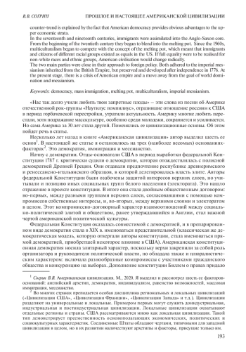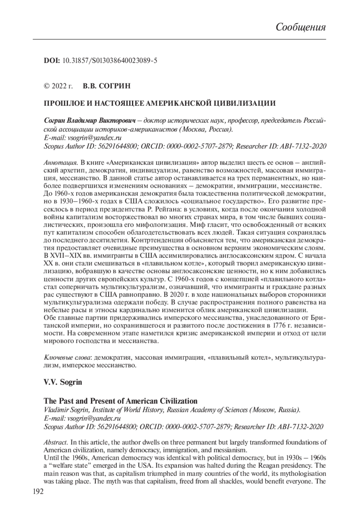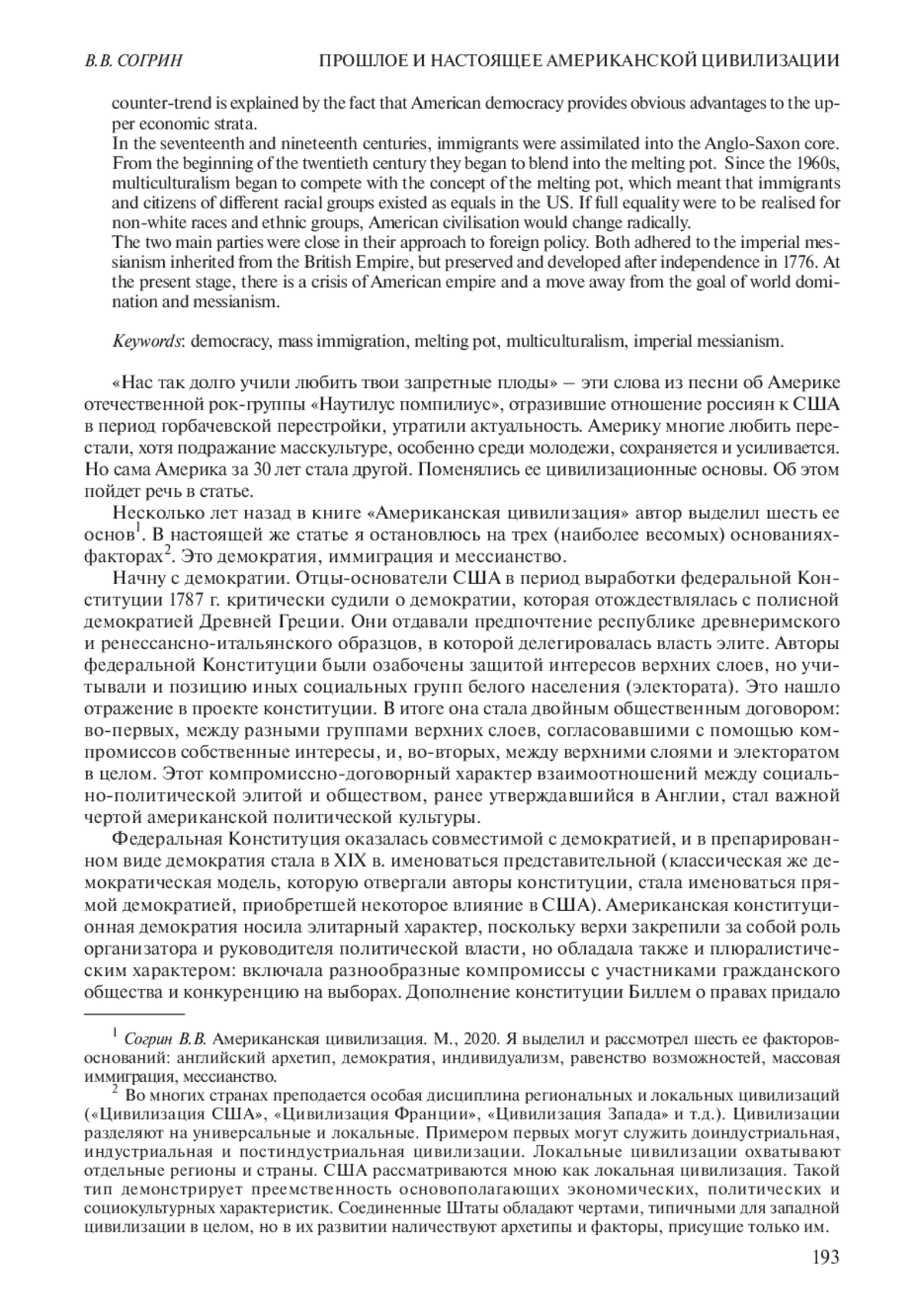 В книге «Американская цивилизация» автор выделил шесть ее основ – английский архетип, демократия, индивидуализм, равенство возможностей, массовая иммиграция, мессианство. В данной статье автор останавливается на трех перманентных, но наиболее подвергшихся изменениям основаниях – демократии, иммиграции, мессианстве. До 1960-х годов американская демократия была тождественна политической демократии, но в 1930–1960-х годах в США сложилось «социальное государство». Его развитие пресеклось в период президентства Р. Рейгана: в условиях, когда после окончания холодной войны капитализм восторжествовал во многих странах мира, в том числе бывших социалистических, произошла его мифологизация. Миф гласит, что освобожденный от всяких пут капитализм способен облагодетельствовать всех людей. Такая ситуация сохранялась до последнего десятилетия. Контртенденция объясняется тем, что американская демократия предоставляет очевидные преимущества в основном верхним экономическим слоям. В XVII–XIX вв. иммигранты в США ассимилировались англосаксонским ядром. С начала ХХ в. они стали смешиваться в «плавильном котле», который творил американскую цивилизацию, вобравшую в качестве основы англосаксонские ценности, но к ним добавились ценности других европейских культур. С 1960-х годов с концепцией «плавильного котла» стал соперничать мультикультурализм, означавший, что иммигранты и граждане разных рас существуют в США равноправно. В 2020 г. в ходе национальных выборов сторонники мультикультурализма одержали победу. В случае распространения полного равенства на небелые расы и этносы кардинально изменится облик американской цивилизации. Обе главные партии придерживались имперского мессианства, унаследованного от Британской империи, но сохранившегося и развитого после достижения в 1776 г. независимости. На современном этапе наметился кризис американской империи и отход от цели мирового господства и мессианства.
