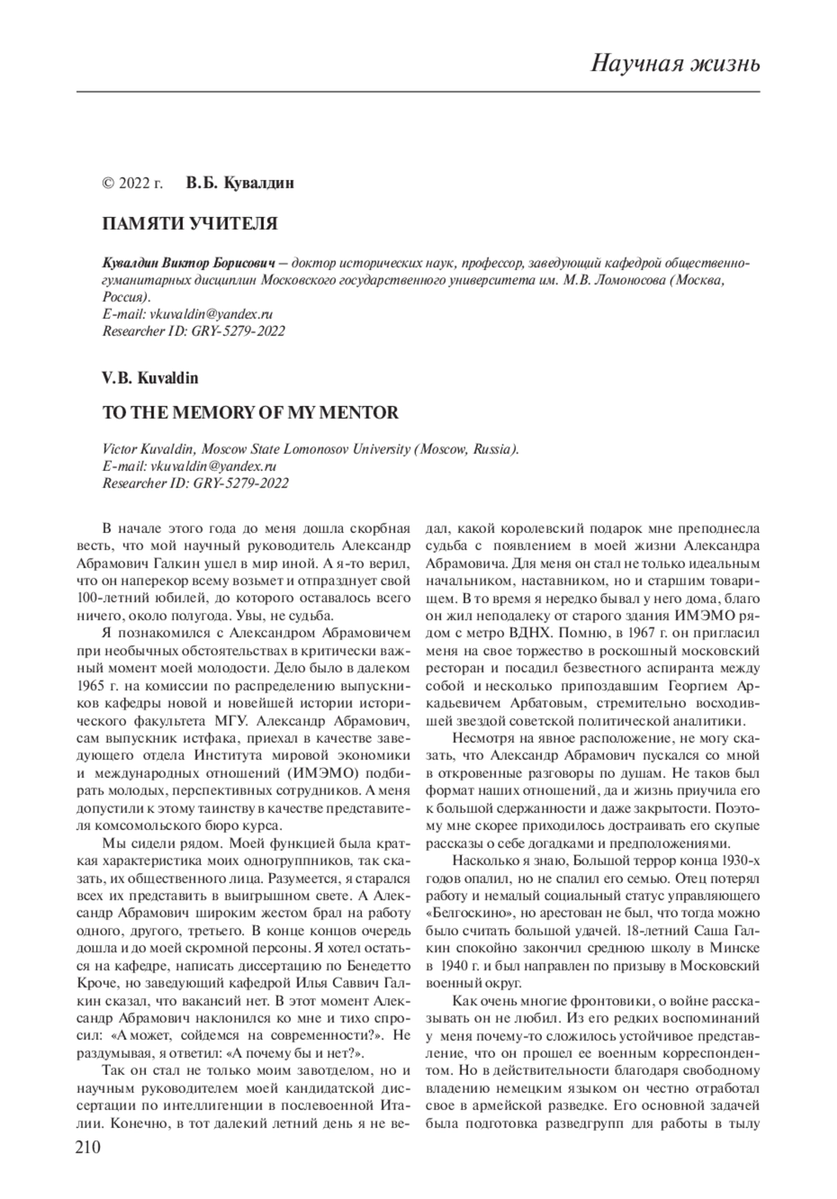 В начале этого года до меня дошла скорбная весть, что мой научный руководитель Александр Абрамович Галкин ушел в мир иной. А я-то верил, что он наперекор всему возьмет и отпразднует свой 100-летний юбилей, до которого оставалось всего ничего, около полугода. Увы, не судьба