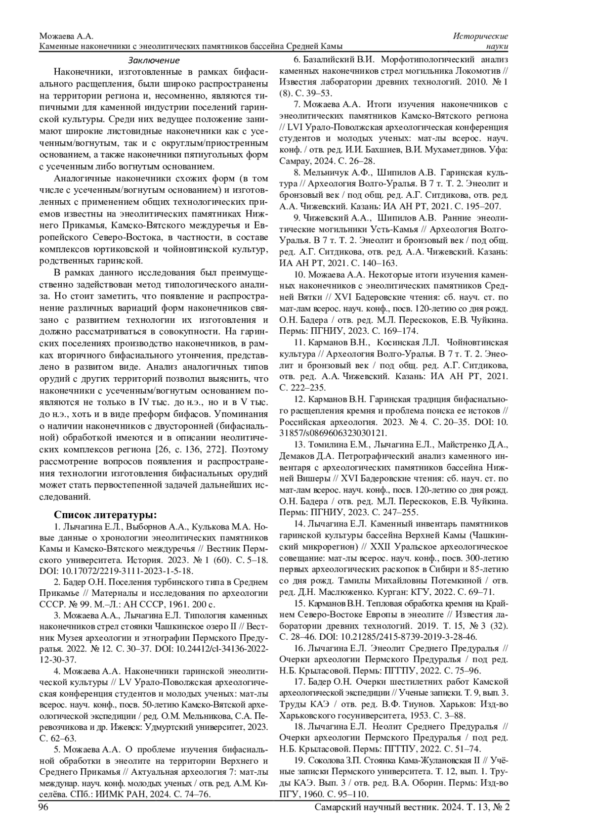 16. 	Лычагина Е.Л. Энеолит Среднего Предуралья // Очерки археологии Пермского Предуралья / под ред. Н.Б. Крыласовой. Пермь: ПГГПУ, 2022. С. 75-96. EDN: VONMGG