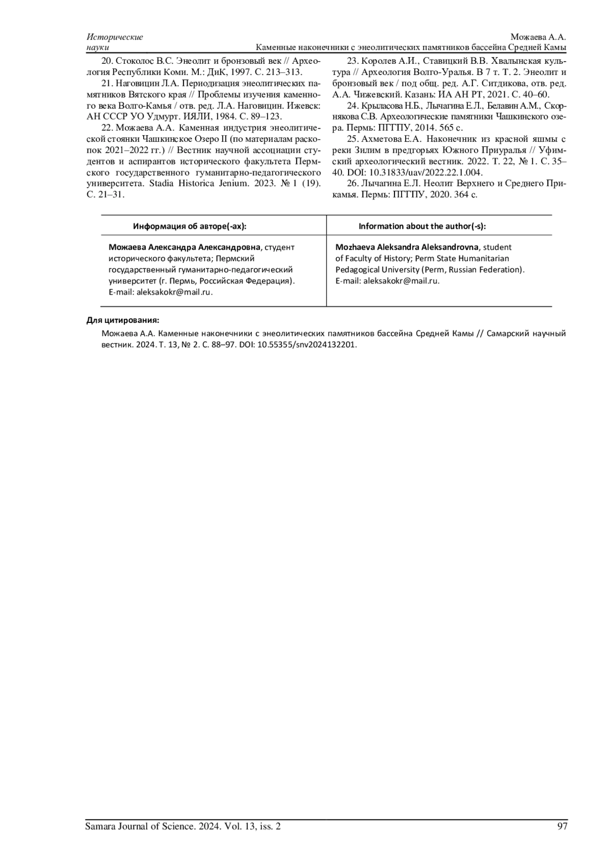 3. 	Можаева А.А., Лычагина Е.Л. Типология каменных наконечников стрел стоянки Чашкинское озеро II // Вестник Музея археологии и этнографии Пермского Предуралья. 2022. № 12. С. 30-37. DOI: 10.24412/cl-34136-2022-12-30-37 EDN: NTVFDL