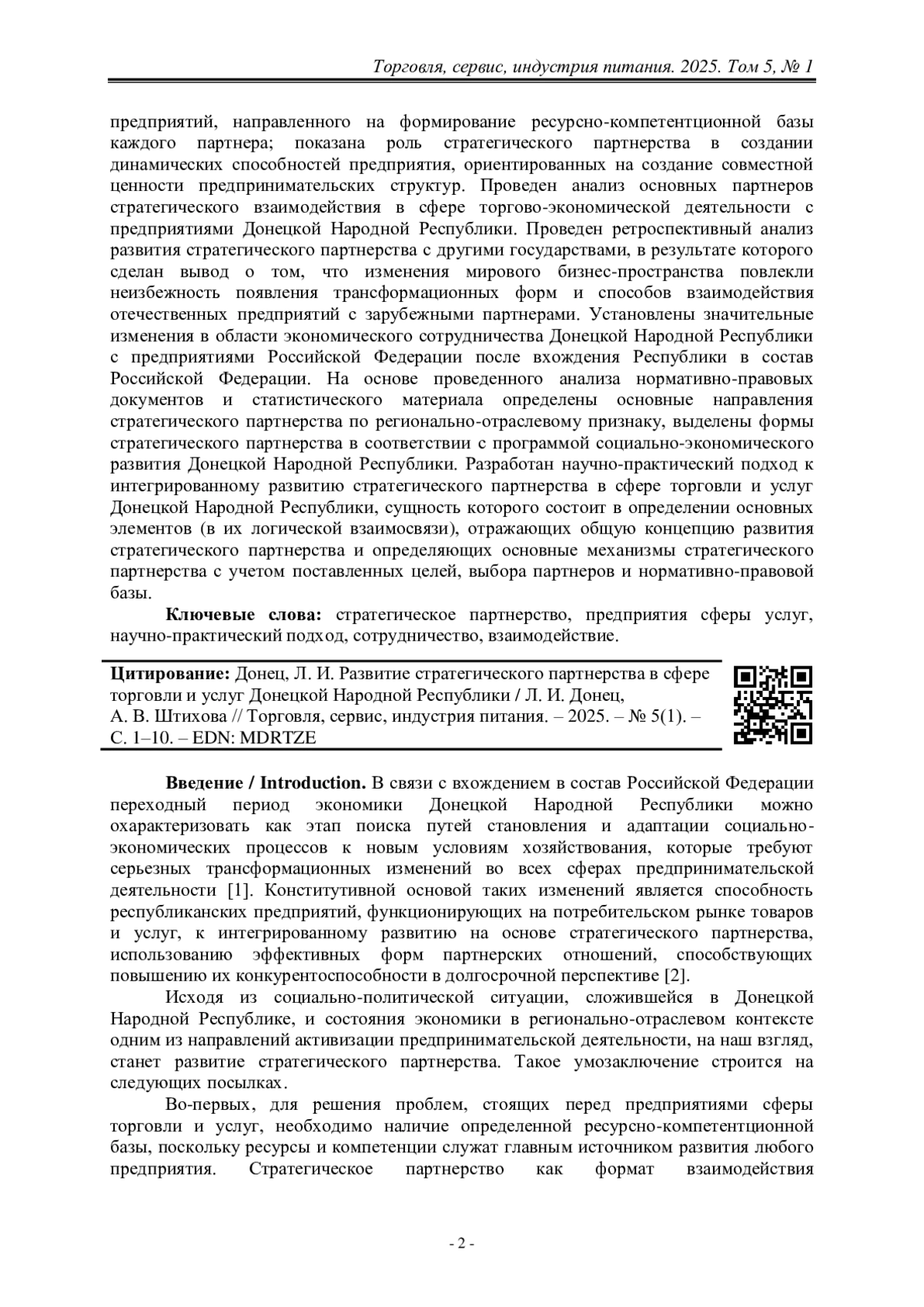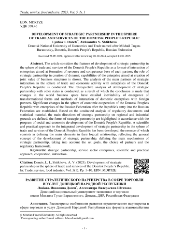 В связи с вхождением в состав Российской Федерации переходный период экономики Донецкой Народной Республики можно охарактеризовать как этап поиска путей становления и адаптации социальноэкономических процессов к новым условиям хозяйствования, которые требуют серьезных трансформационных изменений во всех сферах предпринимательской деятельности [1]. Конститутивной основой таких изменений является способность республиканских предприятий, функционирующих на потребительском рынке товаров и услуг, к интегрированному развитию на основе стратегического партнерства, использованию эффективных форм партнерских отношений, способствующих повышению их конкурентоспособности в долгосрочной перспективе [2].