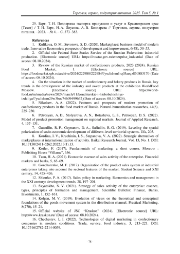 25. Берг, Т. И. Поддержка экспорта продукции и услуг в Красноярском крае [Текст] / Т. И. Берг, Н. А. Леусова, А. В. Бондарева // Торговля, сервис, индустрия питания. –2023. – № 4. – С. 373–383.