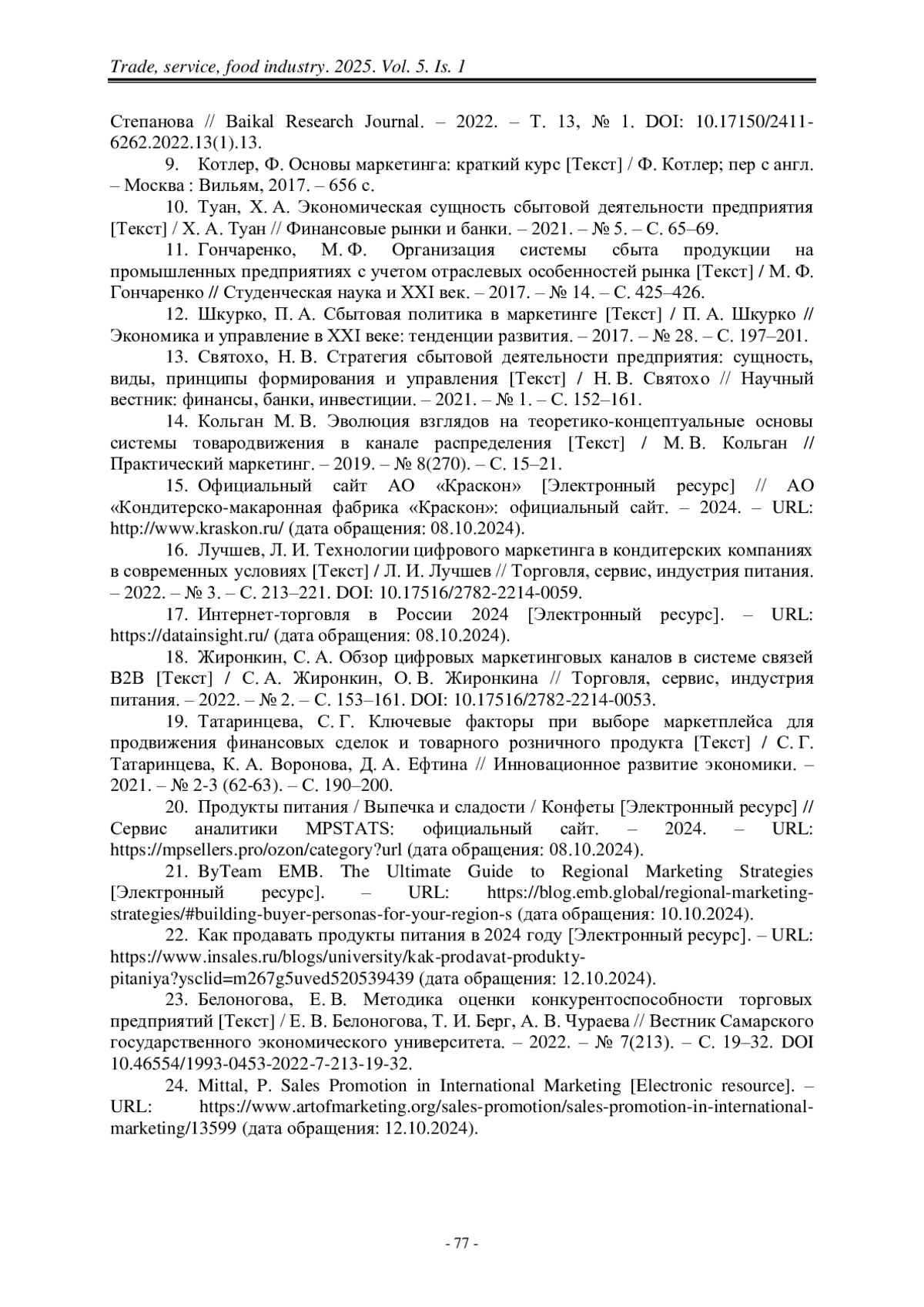 16. Лучшев, Л. И. Технологии цифрового маркетинга в кондитерских компаниях в современных условиях [Текст] / Л. И. Лучшев // Торговля, сервис, индустрия питания. – 2022. – № 3. – С. 213–221. DOI: 10.17516/2782-2214-0059.