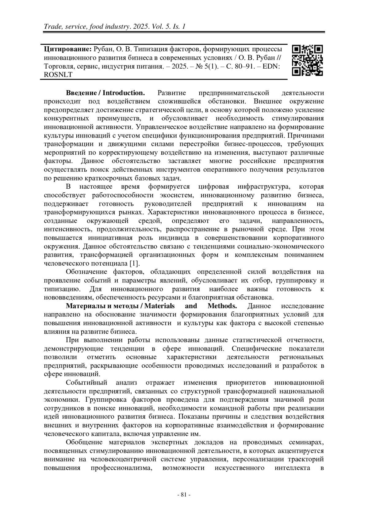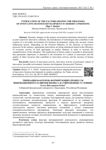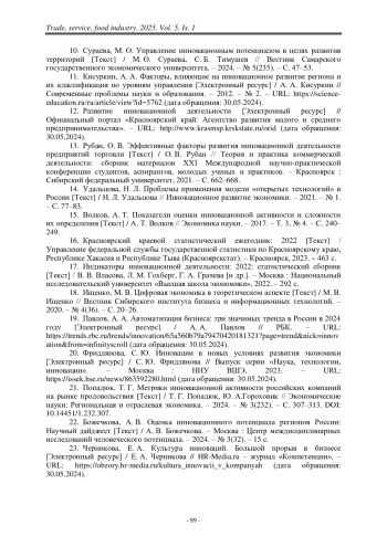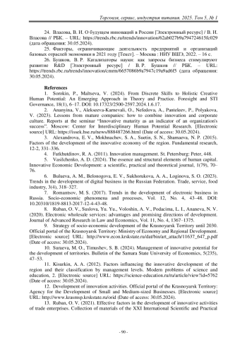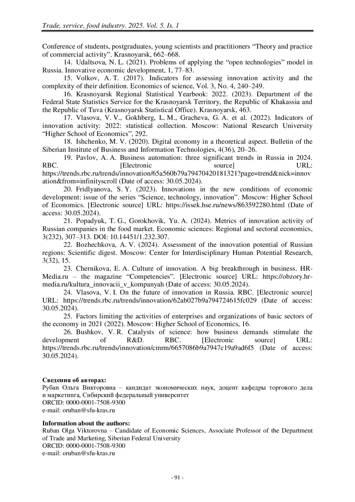13. Рубан, О. В. Эффективные факторы развития инновационной деятельности предприятий торговли [Текст] / О. В. Рубан // Теория и практика коммерческой деятельности: сборник материалов XXI Международной научно-практической конференции студентов, аспирантов, молодых ученых и практиков. – Красноярск : Сибирский федеральный университет, 2021. – С. 662–668.