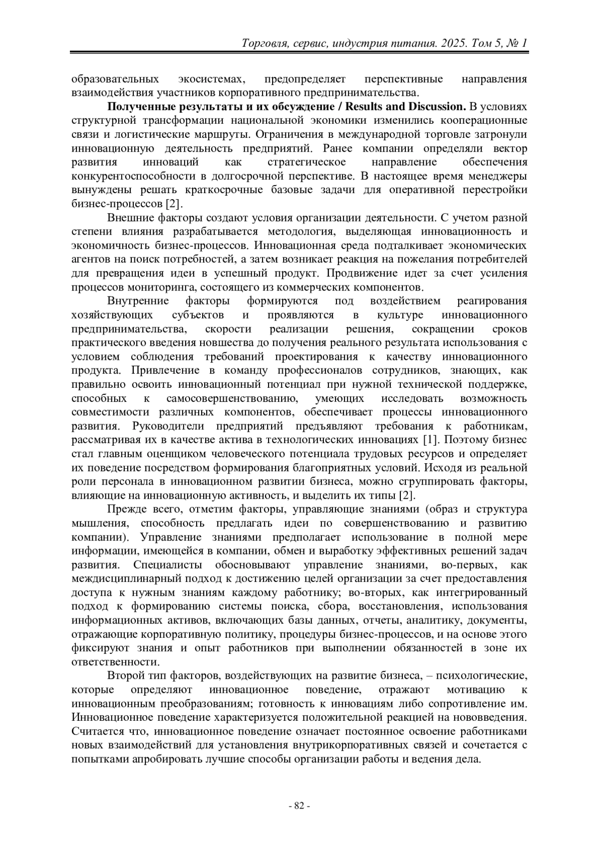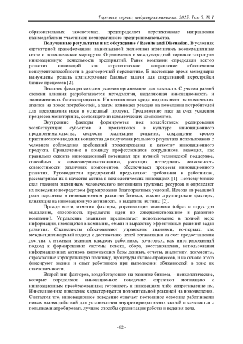 Динамичные изменения партнерской среды обусловливают взаимодействия по совместному поиску инновационных решений, внедрению технологий, способствующих созданию благоприятной среды для развития бизнеса с учетом различных воздействующих факторов. В зависимости от их влияния на интенсивность инновационных процессов в отрасли происходит внедрение соответствующих новшеств, направленных на эффективность хозяйственной деятельности каждого участника рыночных отношений с целью повышения конкурентоспособности предприятия. Типизация факторов показывает, что первостепенное значение придается формированию культуры инноваций и качеству трудовых ресурсов, которые способствуют инновационной активности и наращиванию человеческого капитала.