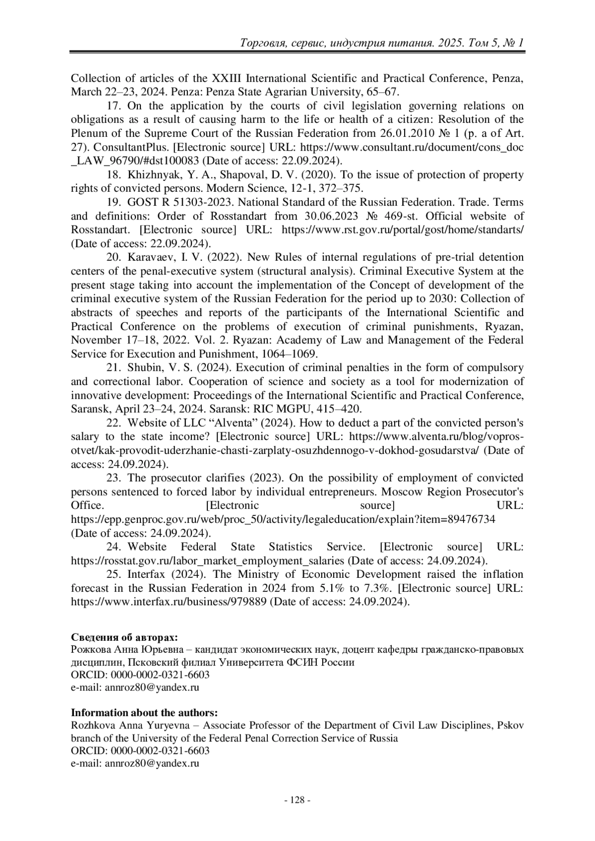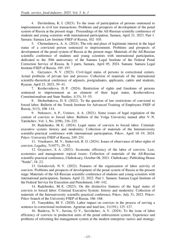 13. Голодович, Н. В. Особенности организации трудовой деятельности осужденных [Текст] / Н. В. Голодович // Проблемы и перспективы развития уголовно- исполнительной системы России на современном этапе: материалы Всероссийской научной конференции обучающихся и молодых ученых с международным участием, Самара, 22 апреля 2022 года. Часть 1. – Самара: Самарский юридический институт Федеральной службы исполнения наказаний, 2022. – С. 140–142.