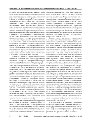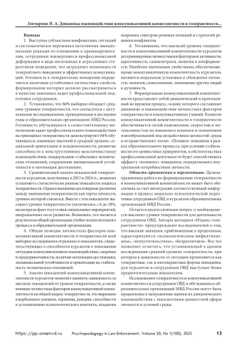1. Толерантность составляет основу коммуникативной компетентности сотрудников органов внутренних дел, в содержании которой отражена динамика взаимодействия личностных факторов устойчивости и коммуникативных умений, что в условиях деятельности способствует конструктивности делового общения, эффективности психологического контакта и процесса общения, развитию навыков психологического взаимодействия, диалога и прогноза успешности коммуникаций.