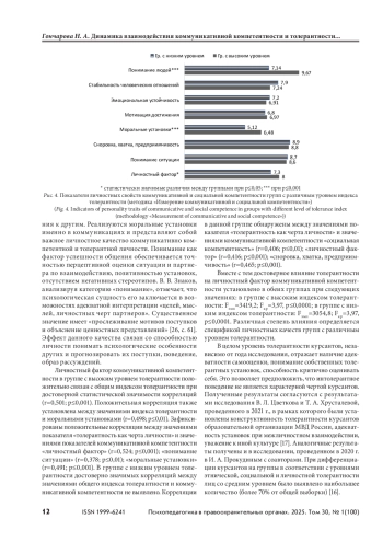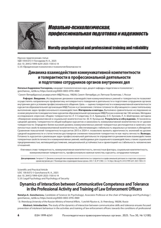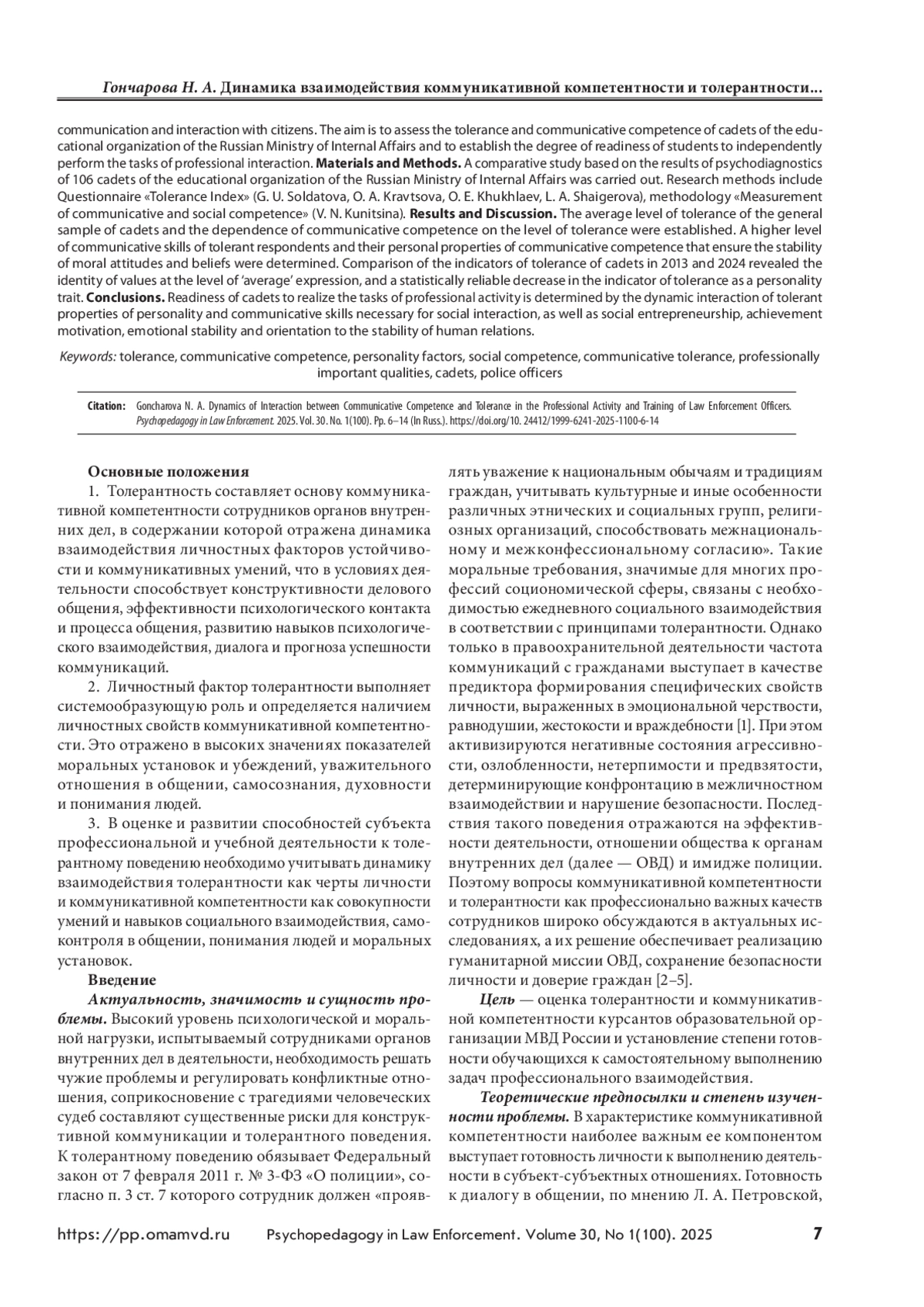 Исследование динамики взаимодействия коммуникативных умений и толерантности позволяет осуществлять направленную профилактику интолерантного поведения в деятельности и подготовке сотрудников органов внутренних дел к условиям профессионального общения. Цель — оценка толерантности и коммуникативной компетентности курсантов образовательной организации МВД России и установление степени готовности обучающихся к самостоятельному выполнению задач профессионального взаимодействия. Материалы и методы. Выполнено сравнительное исследование на основе результатов психодиагностики курсантов образовательной организации МВД России в количестве 106 человек. Методики исследования: опросник «Индекс толерантности» (Г. У. Солдатова, О. А. Кравцова, О. Е. Хухлаев, Л. А. Шайгерова), методика «Измерение коммуникативной и социальной компетентности» (В. Н. Куницына). Результаты и обсуждение. Установлены средний уровень толерантности общей выборки курсантов и зависимость коммуникативной компетентности от уровня толерантности. Определен более высокий уровень коммуникативных умений толерантных респондентов и наличие у них личностных свойств коммуникативной компетентности, обеспечивающих стабильность моральных установок и убеждений. Сравнение показателей толерантности курсантов 2013 и 2024 гг. позволило выявить идентичность значений на уровне средней выраженности и статистически достоверное снижение показателя толерантности как черты личности. Выводы. Готовность курсантов к реализации задач профессиональной деятельности определяется динамическим взаимодействием толерантных свойств личности и коммуникативных умений, необходимых для социального взаимодействия, а также социальной предприимчивостью, мотивацией достижения, эмоциональной устойчивостью и ориентацией на стабильность человеческих отношений.