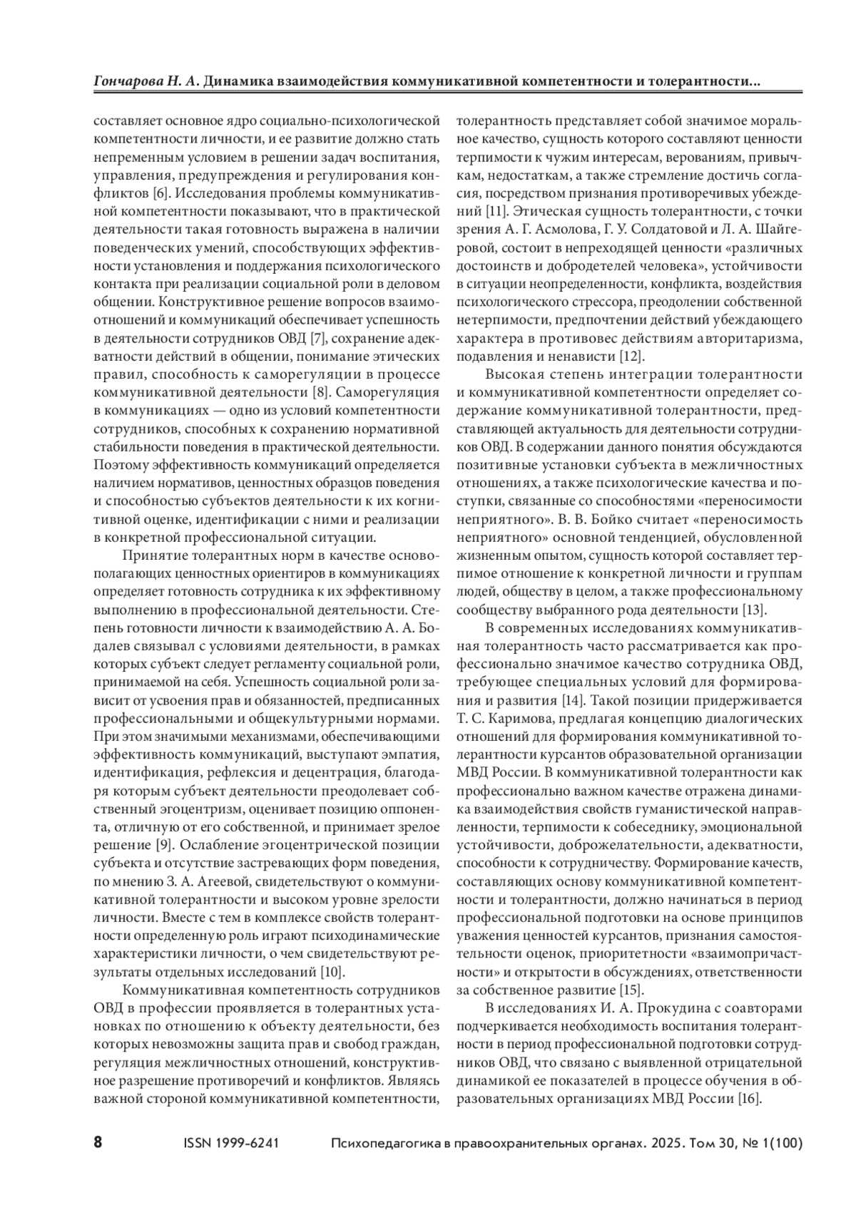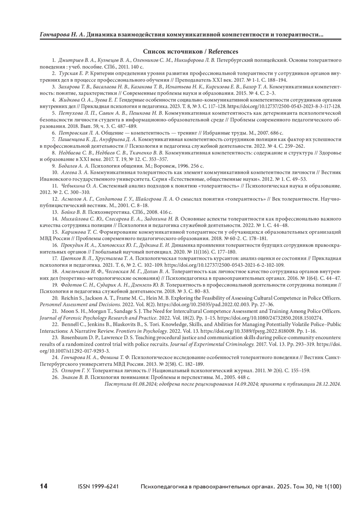 24. Гончарова Н. А., Фомина Т. Ф. Психологическое исследование особенностей толерантного поведения // Вестник Санкт- Петербургского университета МВД России. 2013. № 2(58). С. 182–189.