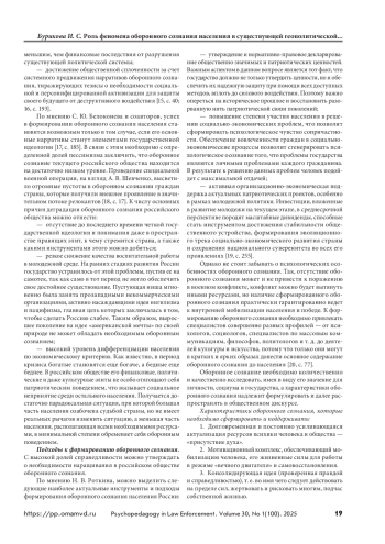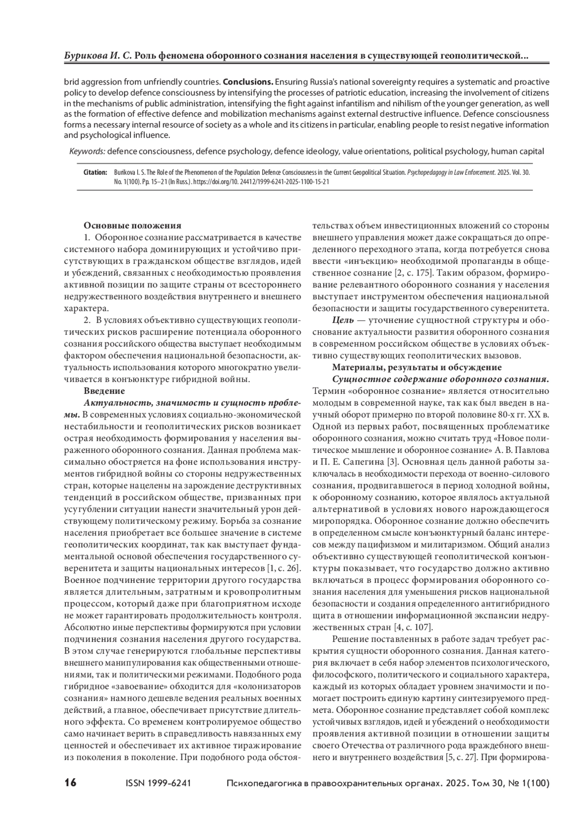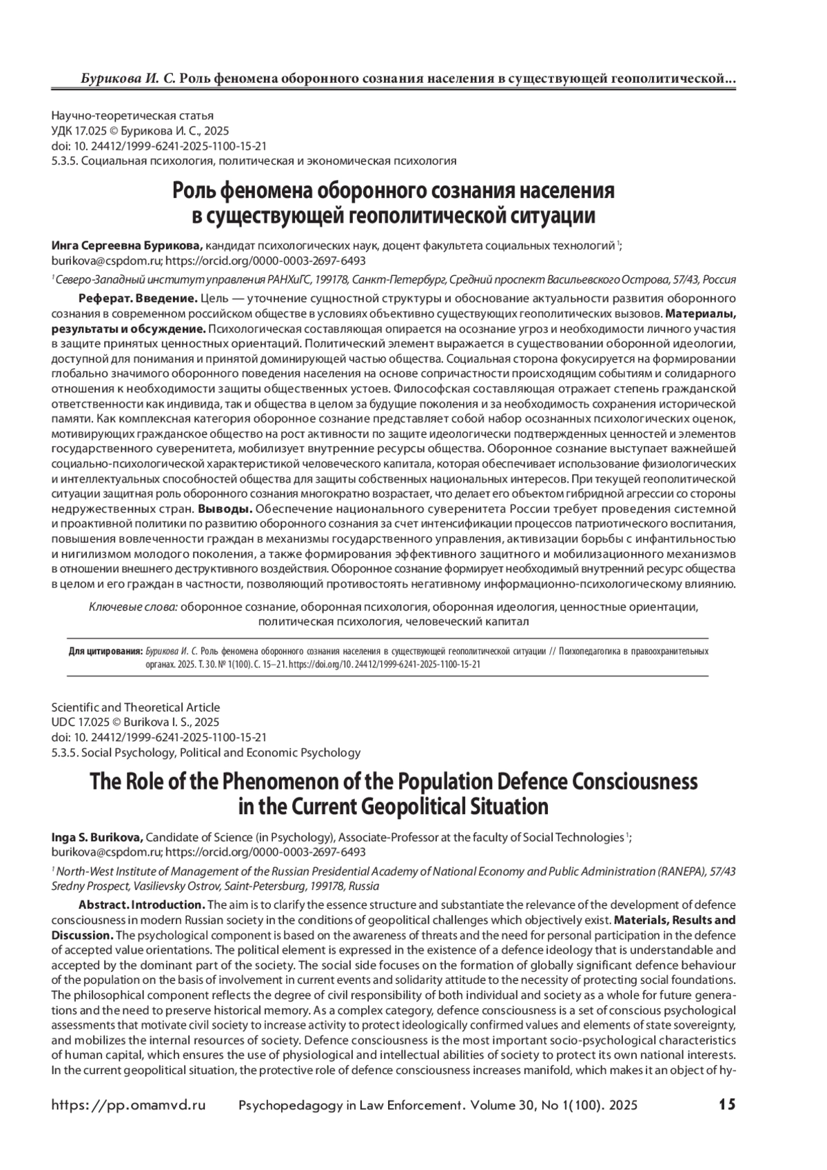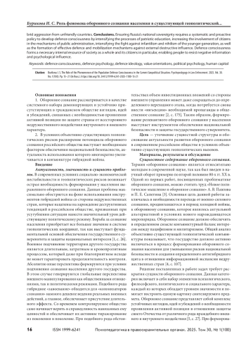 Цель — уточнение сущностной структуры и обоснование актуальности развития оборонного сознания в современном российском обществе в условиях объективно существующих геополитических вызовов. Материалы, результаты и обсуждение. Психологическая составляющая опирается на осознание угроз и необходимости личного участия в защите принятых ценностных ориентаций. Политический элемент выражается в существовании оборонной идеологии, доступной для понимания и принятой доминирующей частью общества. Социальная сторона фокусируется на формировании глобально значимого оборонного поведения населения на основе сопричастности происходящим событиям и солидарного отношения к необходимости защиты общественных устоев. Философская составляющая отражает степень гражданской ответственности как индивида, так и общества в целом за будущие поколения и за необходимость сохранения исторической памяти. Как комплексная категория оборонное сознание представляет собой набор осознанных психологических оценок, мотивирующих гражданское общество на рост активности по защите идеологически подтвержденных ценностей и элементов государственного суверенитета, мобилизует внутренние ресурсы общества. Оборонное сознание выступает важнейшей социально-психологической характеристикой человеческого капитала, которая обеспечивает использование физиологических и интеллектуальных способностей общества для защиты собственных национальных интересов. При текущей геополитической ситуации защитная роль оборонного сознания многократно возрастает, что делает его объектом гибридной агрессии со стороны недружественных стран. Выводы. Обеспечение национального суверенитета России требует проведения системной и проактивной политики по развитию оборонного сознания за счет интенсификации процессов патриотического воспитания, повышения вовлеченности граждан в механизмы государственного управления, активизации борьбы с инфантильностью и нигилизмом молодого поколения, а также формирования эффективного защитного и мобилизационного механизмов в отношении внешнего деструктивного воздействия. Оборонное сознание формирует необходимый внутренний ресурс общества в целом и его граждан в частности, позволяющий противостоять негативному информационно-психологическому влиянию.