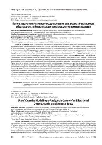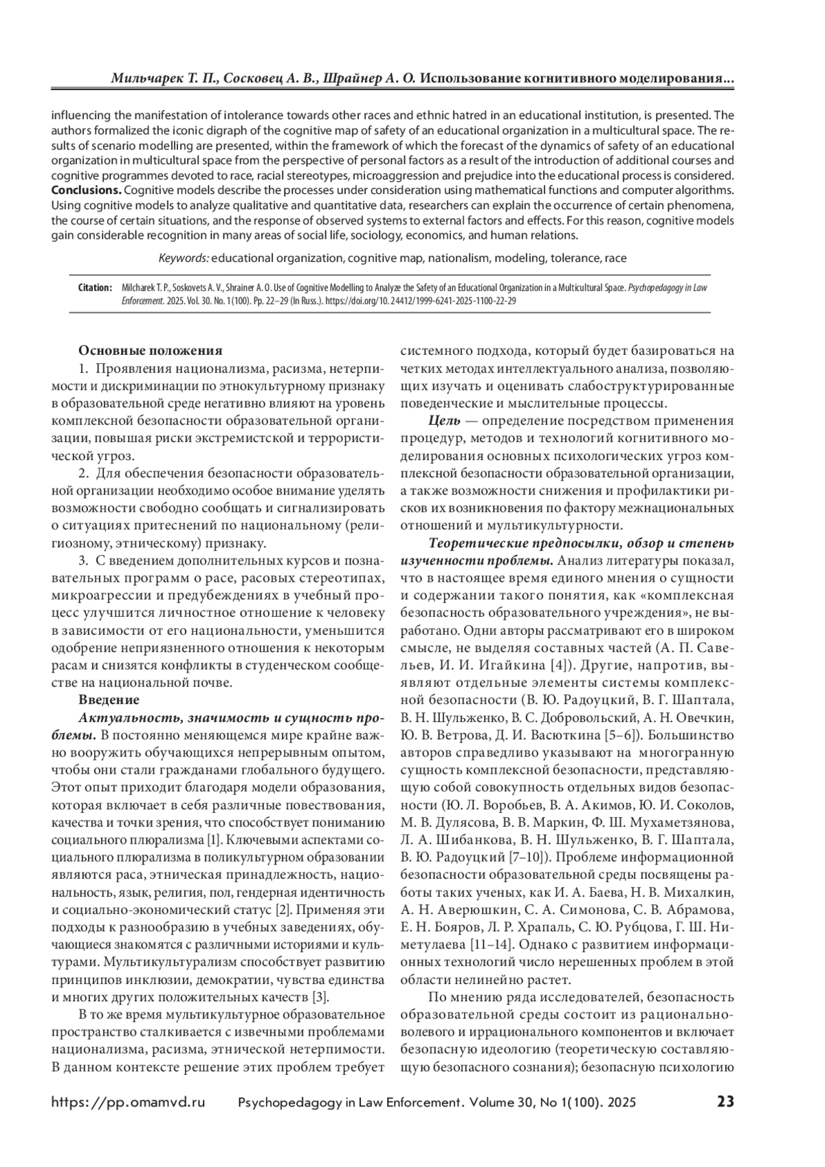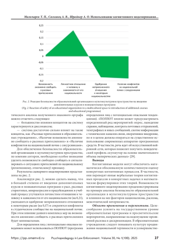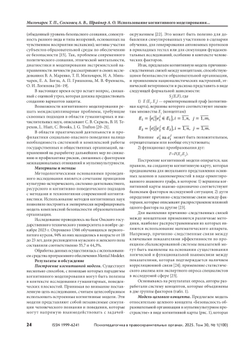 Цель — определить посредством применения процедур, методов и технологий когнитивного моделирования основные психологические угрозы комплексной безопасности образовательной организации, а также возможности снижения и профилактики рисков их возникновения по фактору межнациональных отношений и мультикультурности. Материалы и методы. Исследование проведено на базе Омского государственного технического университета в ноябре–декабре 2023 г. Опрошено 1366 обучающихся первого–пятого курсов, 94% из них — в возрасте от 18 до 23 лет, доли респондентов мужского и женского пола составляли соответственно 55,7 и 44,3%. Обработка данных осуществлялась с использованием средства программного обеспечения Mental Modeler. Результаты и обсуждение. Представлена разработанная авторами система концептов, которые характеризуют факторы на государственном и личностном уровнях, влияющие на проявление нетерпимости к другим расам и этнической ненависти в учебном заведении. Формализован знаковый орграф когнитивной карты безопасности образовательной организации в мультикультурном пространстве. Представлены результаты сценарного моделирования, в рамках которого рассмотрен прогноз динамики безопасности образовательной организации в мультикультурном пространстве с позиций личностных факторов в результате введения дополнительных курсов и познавательных программ о расе, расовых стереотипах, микроагрессии и предубеждениях в учебный процесс. Выводы. Когнитивные модели описывают наблюдаемые процессы с помощью математических функций и компьютерных алгоритмов. Используя когнитивные модели для анализа качественных и количественных данных, исследователи могут объяснить возникновение тех или иных феноменов, протекание определенных ситуаций и реакцию со стороны наблюдаемых систем на проявление внешних факторов и эффектов. По этой причине когнитивные модели пользуются значительным успехом во многих областях общественной жизни, социологии, экономики, человеческих отношений.